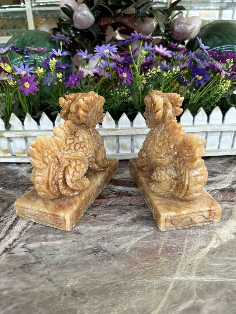 Hợp mệnh Thổ - Kim Chất liệu: Đá cẩm thạch vàng cà rốt Kích thước: Dài 15 cm X Rộng 6 cm x Cao 12,5 cm Khối lượng: 3,2 kg / cặp Ý nghĩa Tỳ