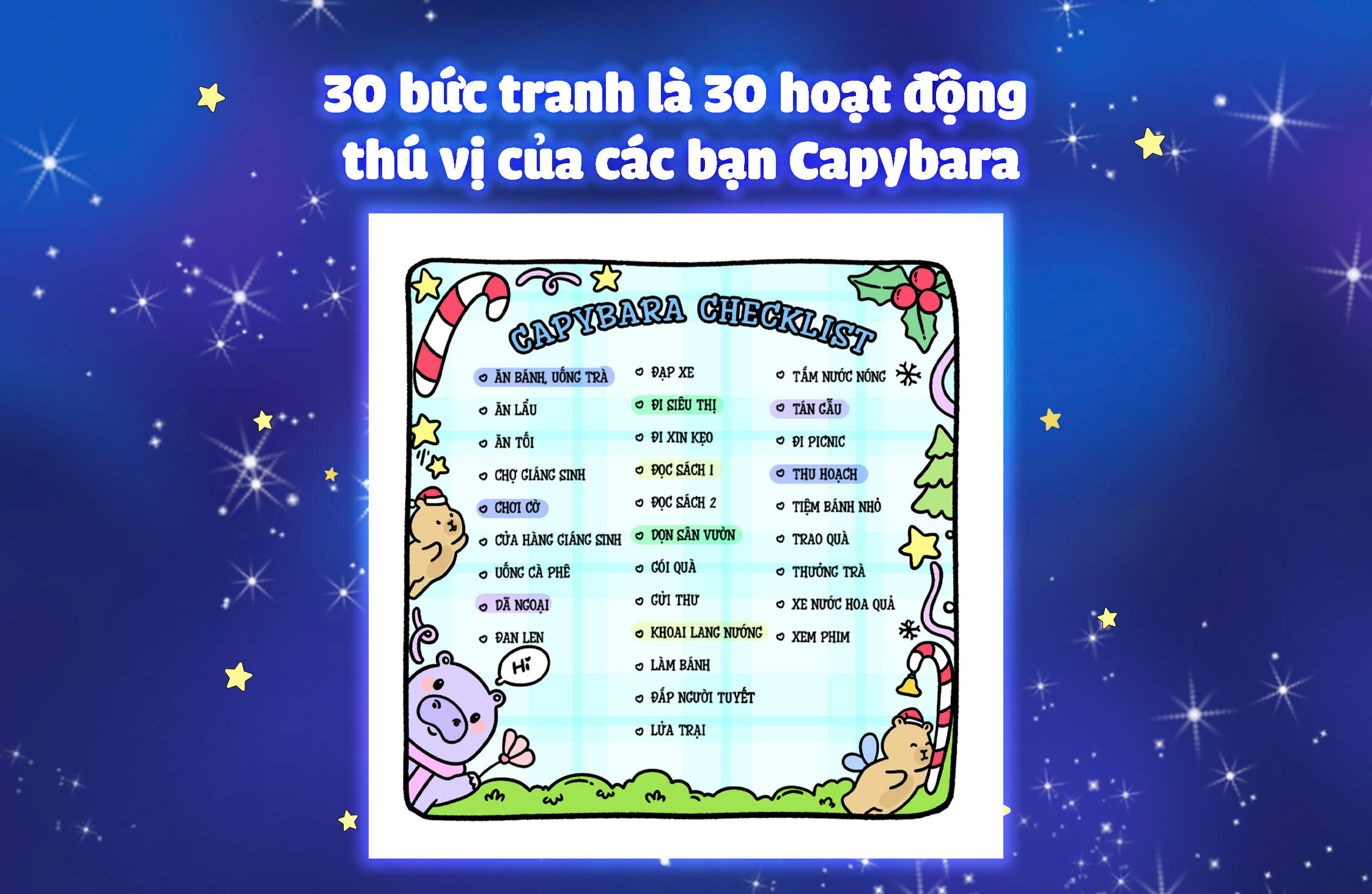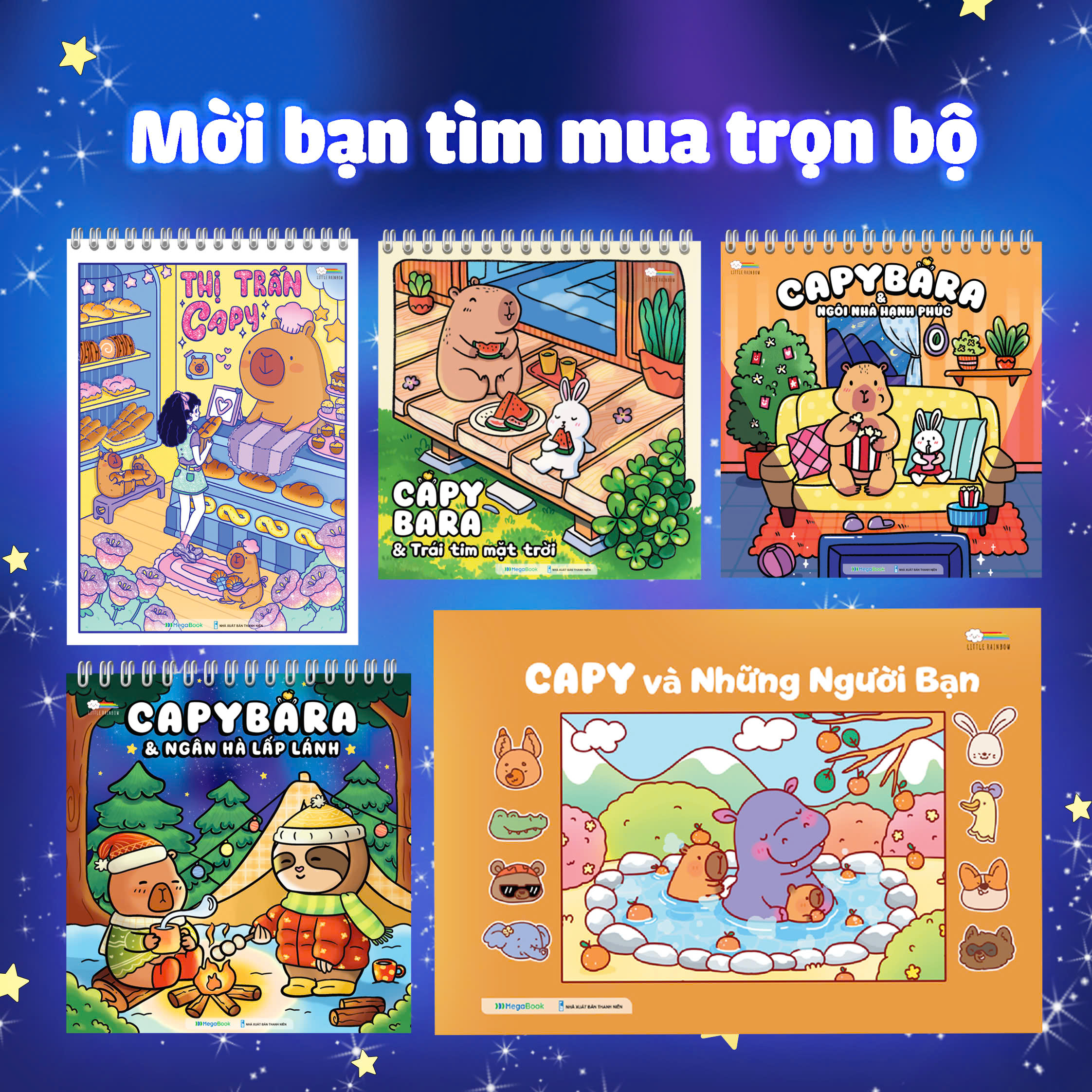 "Capybara & Ngân hà lấp lánh" là cuốn sách tô màu mang đến một chuyến hành trình nhẹ nhàng cùng chú Capybara dễ thương và những người bạn của mình. Với 30 bức tranh là các hoạt động đáng yêu, cuốn sách đưa bạn lạc vào thế giới vô tư, nơi cảm xúc trong trẻo và những niềm vui giản dị luôn ngập tràn. Đây không chỉ là những hình ảnh để tô màu mà còn là lời nhắc nhở yêu thương về hạnh phúc đến từ những điều đơn giản. Hãy cùng Capybara tìm lại sự bình yên và sẻ chia trong mỗi khoảnh khắc đời thường.