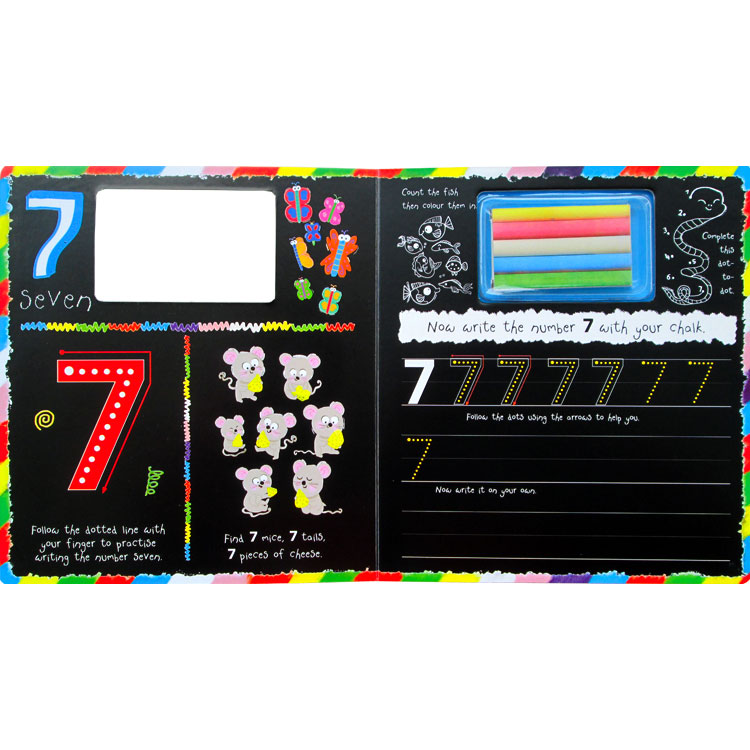 Practise writing and reading numbers 1-10, with five colourful chalks and fun-packed wipe-clean pages.