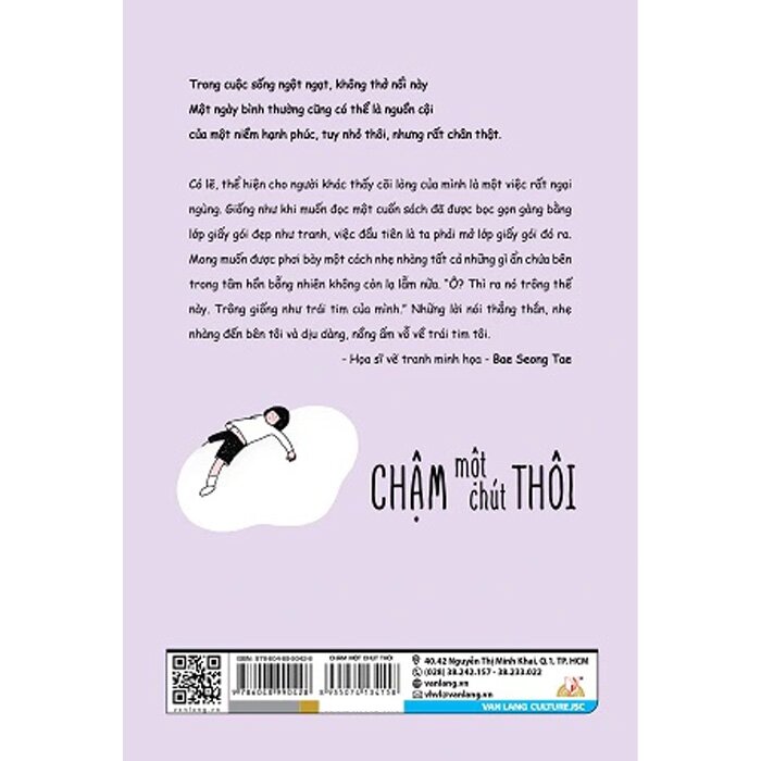 Chậm Một Chút Thôi Trong cuộc sống ngột ngạt, không thở nổi này. Một ngày bình thường cũng có thể là nguồn cội của một niềm hạnh phúc, tuy nhỏ thôi, nhưng rất chân thật. Có lẽ, thể hiện cho người khác thấy cõi lòng của mình là một việc rất ngại ngùng. Giống như khi muốn đọc một cuốn sách đã được bọc gọn gàng bằng lớp giấy gói đẹp như tranh, việc đầu tiên là ta phải mở lớp giấy gói đó ra. Mong muốn được phơi bày một cách nhẹ nhàng tất cả những gì ẩn chứa bên trong tâm hồn bỗng nhiên không còn lạ lẫm nữa. "Ô? Thì ra nó trông thế này. Trông giống như trái tim của mình." Những lời nói thẳng thắn, nhẹ nhàng đến bên tôi và dịu dàng, nồng ấm vỗ về trái tim tôi.