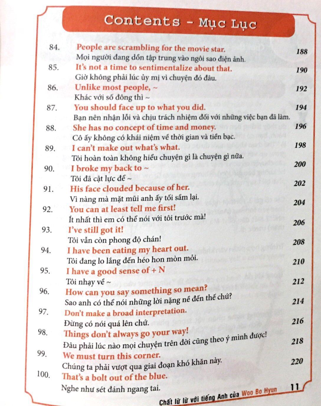 Sử dụng tiếng Anh đẳng cấp không chỉ là giao tiếp lưu loát với người nước ngoài, hay viết được một bài luận mang tính học thuật vô cùng cao siêu. Đối với tôi, đẳng cấp của việc sử dụng tiếng Anh còn là việc có thể nói ra những câu rất “bình dân” mà người bản xứ hay dùng. Phải đấy! Những câu tuy rất “bình dân” đối với người bản xứ, nhưng chúng ta dù học tiếng Anh cả chục năm trời cũng chưa chắc biết được, chẳng hạn như “Bạn chỉ được cái võ mồm” (You’re bold in your words only), “Tôi vẫn còn phong độ chán” (I’ve still got it), “Xin lỗi thôi thì xong chắc” (Sorry is not going to cut it), “Tình yêu có mài ra ăn được đâu, chín chắn lên đi” (Love doesn’t feed you, grow up)… Tác giả chia sẻ trên báo Interview365 của Hàn: “Học thuộc những câu nói thường ngày của người bản xứ mới vận dụng được tiếng Anh trong mọi tình huống, nhờ đó rút ngắn con đường học tập”.