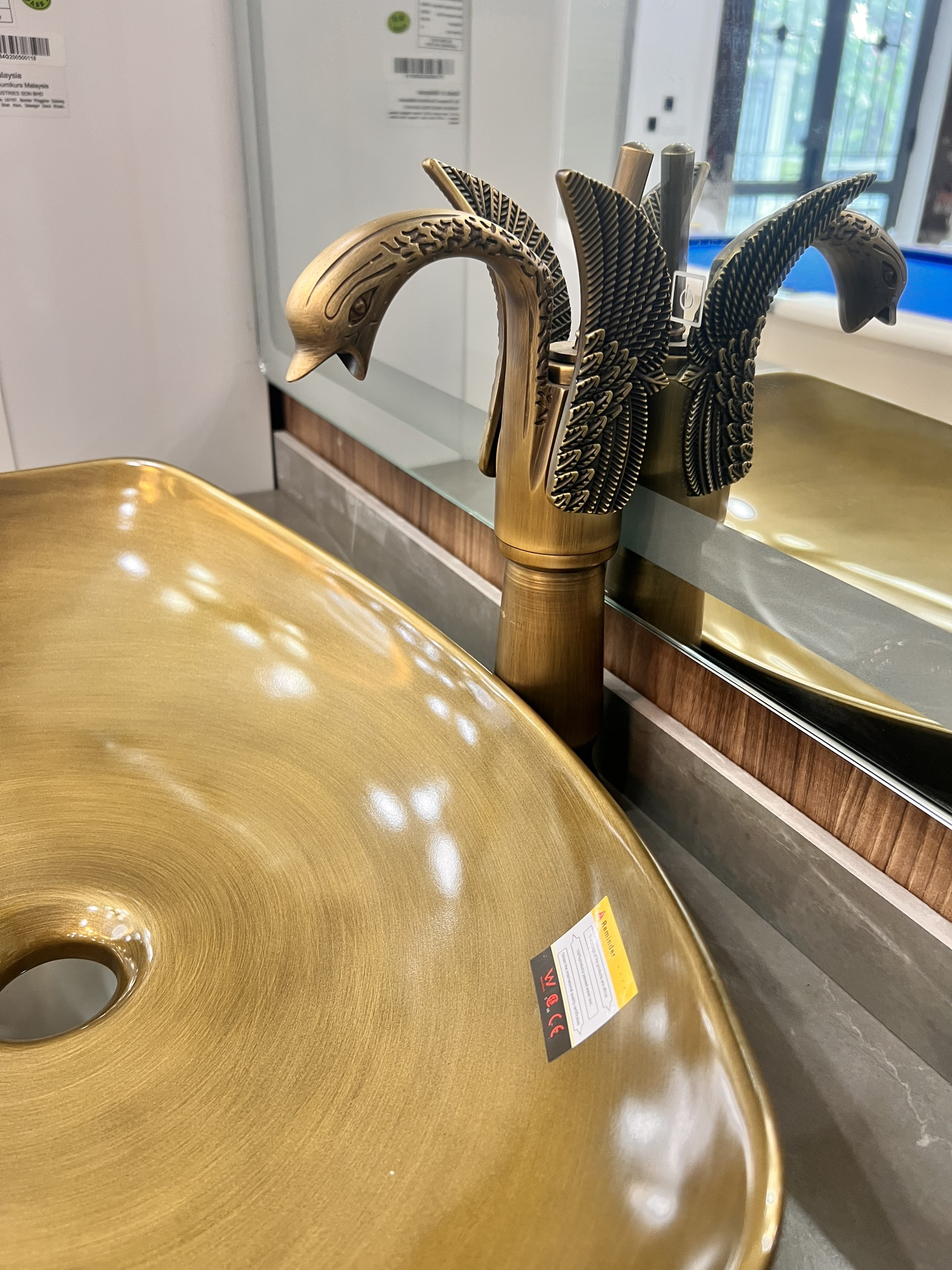 Nguyên liệu: Sử dụng đất sét và những nguyên liệu tối ưu từ thiên nhiên Lớp men sử dụng nguyên liệu khoáng chất thiên nhiên, không chứa Oxit Chì và các chất độc hại. Chậu rửa mặt dương bàn màu đồng bóng Kích thước: 560x410x180 mm Chất liệu : sứ nung nano chống bám bẩn , màu đồng bóng hạn chế bám bẩn Kiểu dáng : Màu đồng cổ kính