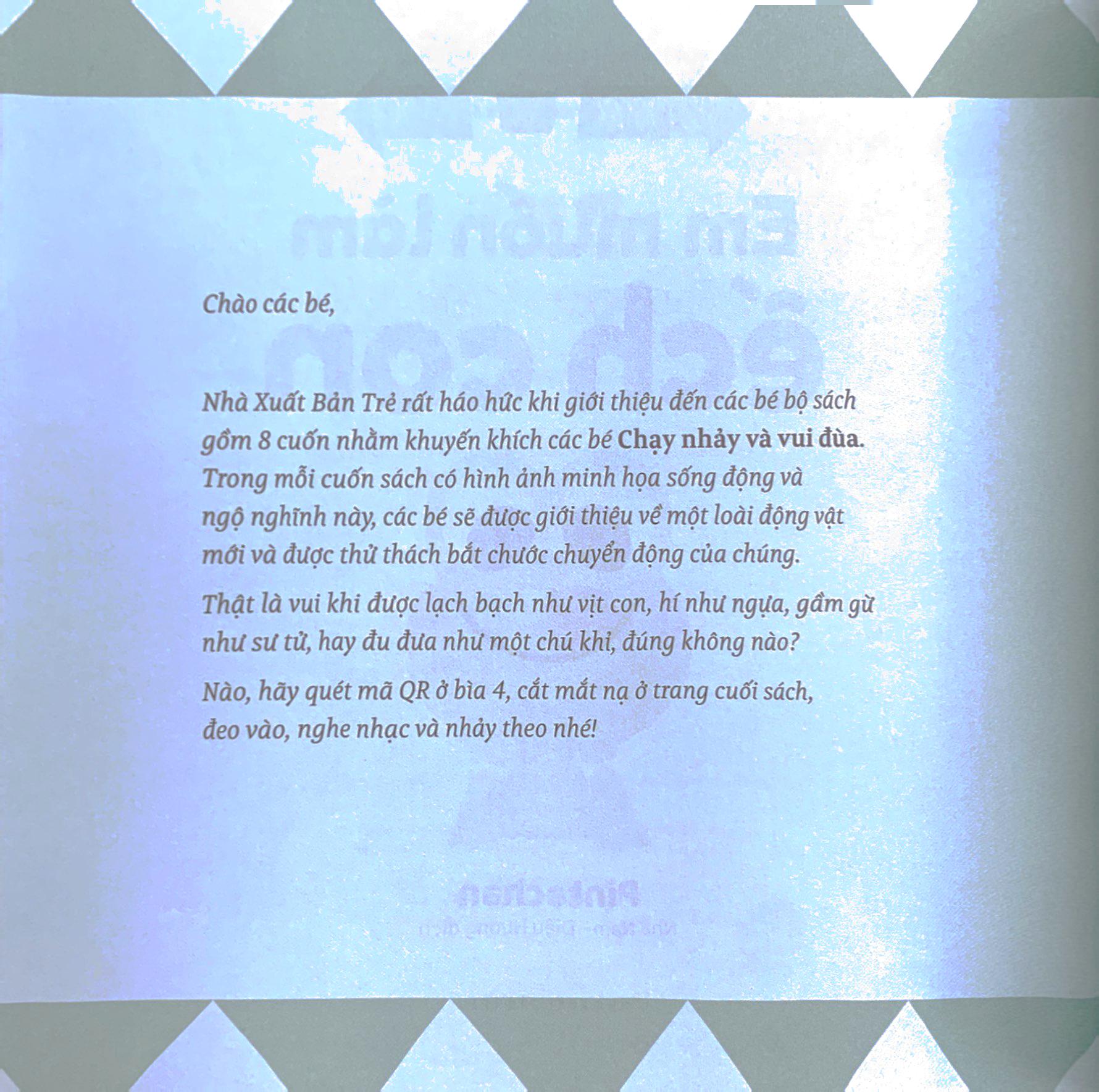 Đây là bộ sách tương tác, giúp các em mô phỏng theo các hoạt động của các loài thú. Dưới sự hỗ trợ ban đầu của phụ huynh hoặc giáo viên, sẽ giúp các em bắt chước theo tiếng kêu, điệu bộ và hoạt động đặc trưng của từng loài thú, giúp cho việc đọc sách của các em trở nên sinh động, đồng thời việc bắt chước theo các hoạt động của các loài thú sẽ giúp các em rèn luyện thể chất, tăng cường vận động. Hoạt động này giúp các em đạt được hai lợi ích là vừa vui chơi vừa học tập.