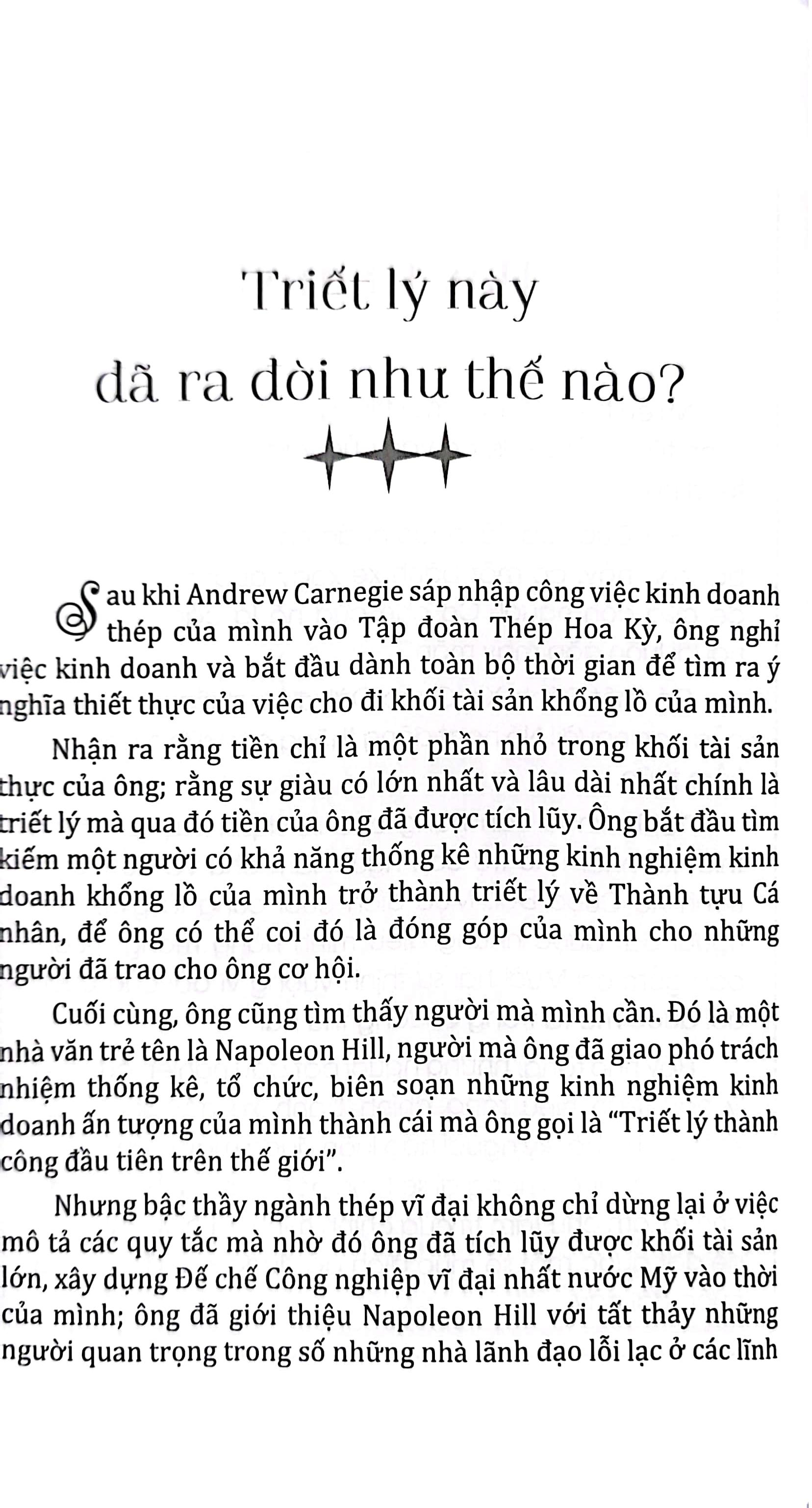 Khi còn là một phóng viên 25 tuổi của tạp chí Thành công, Napoleon Hill đã được cử đi phỏng vấn người giàu nhất ở nước Mỹ: ông trùm ngành thép Andrew Carnegie. Và ngay trong buổi phỏng vấn đó, Carnegie đã đề nghị chia cho Hill phần lớn tài sản của ông. Đó không phải là tiền bạc mà là sự thông thái mà ông tích lũy được về cách bất kì ai cũng có thể trở nên giàu có.