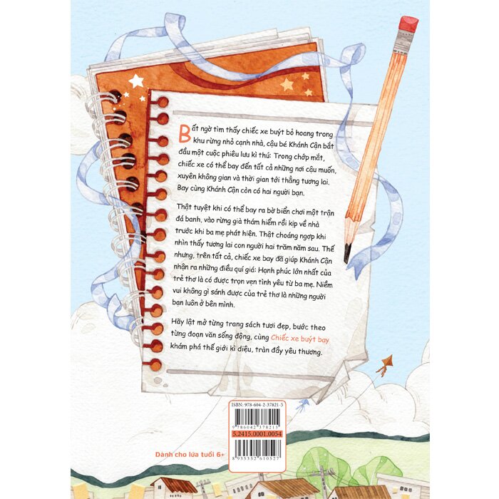 Chiếc Xe Buýt Bay Bất ngờ tìm thấy chiếc xe buýt bỏ hoang trong khu rừng nhỏ cạnh nhà, cậu bé Khánh Cận bắt đầu một cuộc phiêu lưu kì thú: Trong chớp mắt, chiếc xe có thể bay đến tất cả những nơi cậu muốn, xuyên không gian và thời gian tới thẳng tương lai. Bay cùng Khánh Cận còn có hai người bạn. Thật tuyệt khi có thể bay ra bờ biển chơi một trận đá banh, vào rừng già thám hiểm rồi kịp về nhà trước khi ba mẹ phát hiện. Thật choáng ngợp khi nhìn thấy tương lai con người hai trăm năm sau. Thế nhưng, trên tất cả, chiếc xe bay đã giúp Khánh Cận nhận ra những điều quí giá: Hạnh phúc lớn nhất của trẻ thơ là có được trọn vẹn tình yêu từ ba mẹ. Niềm vui không gì sánh được của trẻ thơ là những người bạn luôn ở bên mình. Hãy lật mở từng trang sách tươi đẹp, bước theo từng đoạn văn sống động, cùng Chiếc xe buýt bay khám phá thế giới kì diệu, tràn đầy yêu thương. “Hãy biết trân trọng những gì mình có. Dù lúc này bên Khánh Cận không có chiếc xe buýt đến từ tương lai, nhưng cậu đang có đủ cả ba, cả mẹ, những người luôn thương yêu cậu.”