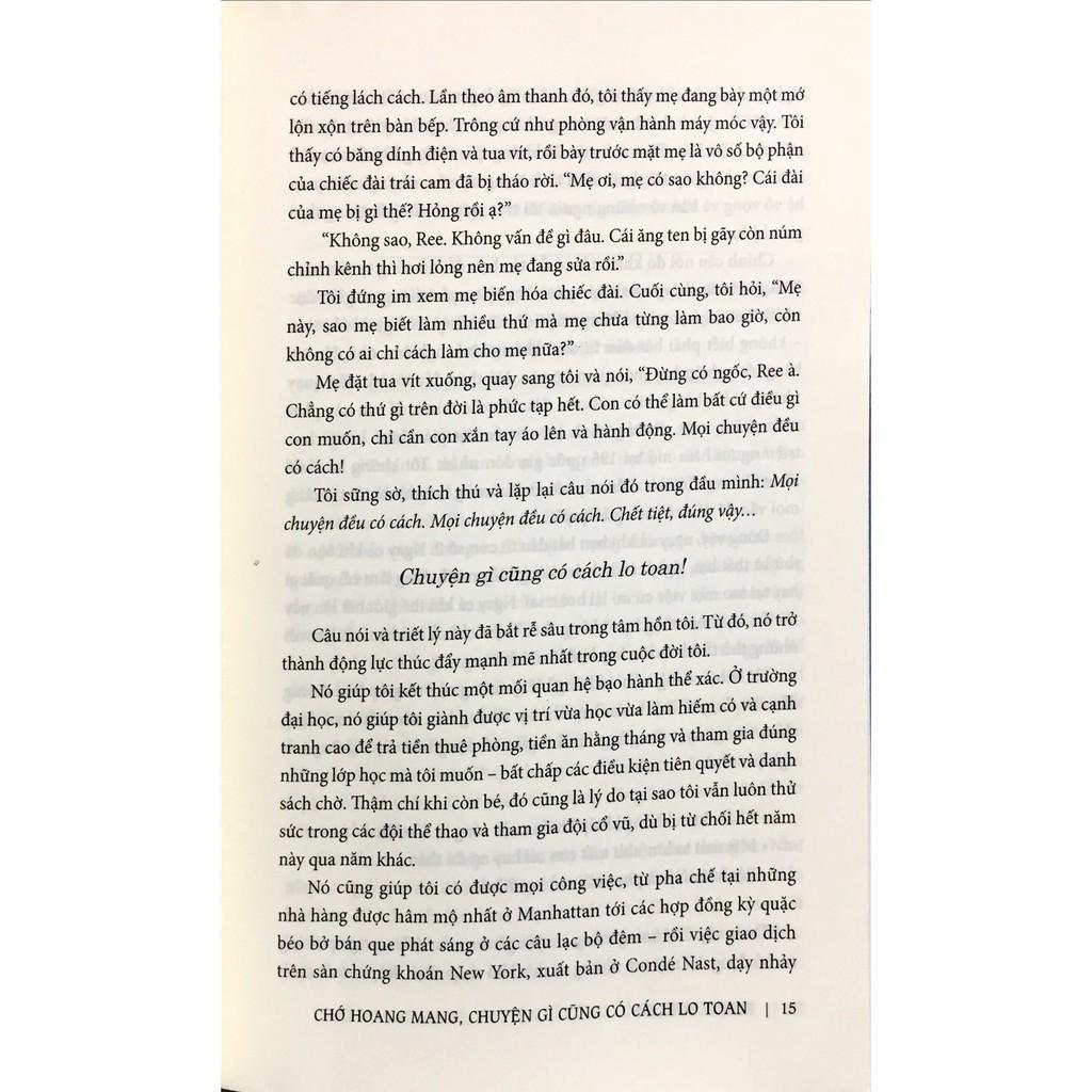 Được viết bởi Marie Forleo, một người vô cùng thông minh, dễ gần và năng nổ, Chớ hoang mang, chuyện gì cũng có cách lo toan là một cuốn sách dễ đọc, truyền cảm hứng, đôi khi hài hước nhưng mang thông điệp rõ ràng: Bạn có thể làm bất cứ điều gì bạn thực sự muốn, chỉ cần kiên trì và sẵn sàng nổ lực để thực hiện nó.