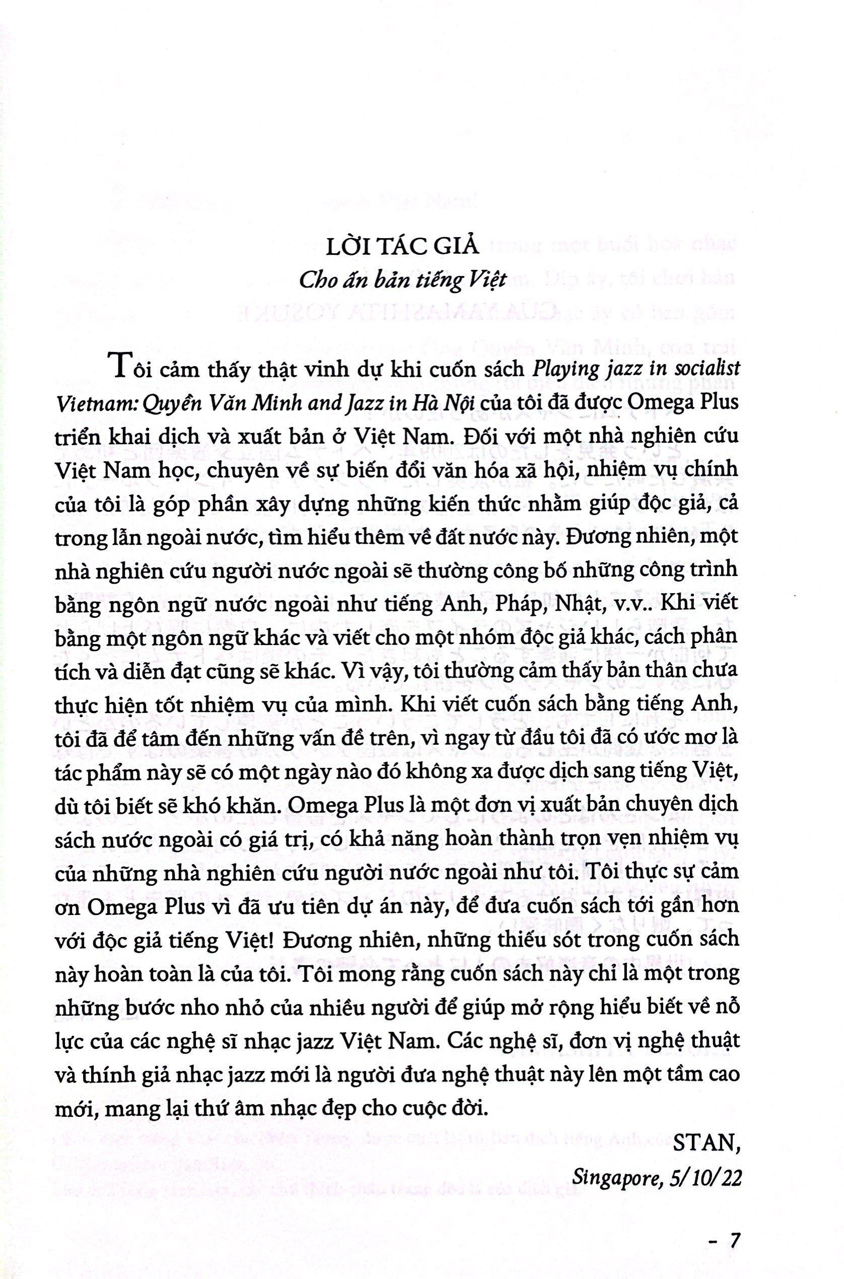 - Chơi jazz ở Việt Nam là một bài tập tự sự có tính cộng tác, sử dụng những lời của đích thân Quyền Văn Minh mà tôi xâu chuỗi lại như một trò chơi xếp hình từ rất nhiều cuộc đối thoại giữa chúng tôi trong những năm từ 2009 đến 2017. […] Tôi chịu trách nhiệm tổ chức vô số chủ đề trong các cuộc trò chuyện của chúng tôi những năm qua, như tôi hy vọng, thành một tự sự trôi chảy để phản chiếu những cột mốc quan trọng với Minh cùng triết lý sống của ông trên tư cách một nhạc sĩ jazz và một nhà giáo jazz Việt Nam. (tr.17)