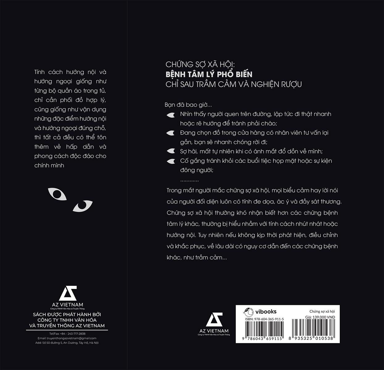 - Cố gắng tránh khỏi các buổi tiệc họp mặt hoặc sự kiện đông người… Nếu bạn đang cảm thấy lo sợ khi phải giao tiếp với mọi người, chỉ muốn nhốt mình trong phòng và không muốn gặp ai, thì rất có thể bạn đã mắc chứng sợ xã hội. Hội chứng này khiến nhiều người tách biệt khỏi xã hội, thậm chí chất lượng cuộc sống của họ cũng sa sút trầm trọng mà không ai biết, bởi người sợ xã hội không muốn tiếp xúc với bất kỳ ai, kể cả người thân của họ. Rất nhiều người vẫn chưa biết mình là nạn nhân của chứng sợ xã hội, mà chỉ đơn giản nghĩ rằng cảm thấy mệt và muốn tách biệt với thế giới xô bồ mà thôi. Những giao tiếp rất bình thường với đa số chúng ta lại chẳng khác nào cơn ác mộng đối với người mắc chứng sợ xã hội, một thảm cảnh mà họ chỉ muốn thoát khỏi. Chính vì sự giày vò ấy, cuộc sống của những người mắc chứng bệnh này bị ảnh hưởng sâu sắc, chất lượng cuộc sống sa sút trầm trọng. Cuốn sách “Chứng sợ xã hội - Bình thường hay bất thường” của tác giả Lê Thụy Phương là cuốn sách tâm lý học tổng hợp đầy đủ, ngắn gọn, dễ hiểu nhất về các hội chứng tâm lý đang tiềm ẩn trong xã hội. Điểm khác biệt tạo nên sức hấp dẫn của cuốn sách là việc sử dụng những hình ảnh minh họa, ví dụ thực tiễn và các bài trắc nghiệm vui ngắn giúp bạn đọc dễ dàng tiếp cận và áp dụng. Nếu bạn cũng đang gặp phải những tình trạng tâm lý tương tự thì cuốn sách “Chứng sợ xã hội” sẽ giúp bạn: Hiểu rõ về bản thân, đọc vị chính mình, từ đó bước ra khỏi cuộc sống bị nỗi sợ xã hội chi phối. Tìm ra phương thức giao tiếp xã hội phù hợp với chính mình và tự tin đứng trước đám đông. Tập trung vào niềm tin nội tại, thực hành khắc phục nỗi sợ giúp bạn thoát khỏi di chứng của chứng sợ xã hội để thực sự tận hưởng niềm vui cuộc sống. Sách được xuất bản và phát hành bởi Vibooks - thương hiệu sách kỹ năng - truyền cảm hứng dành cho người Việt trẻ.