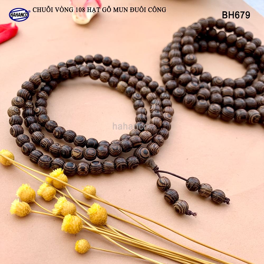 Vòng đeo tay chuỗi tràng 108 hạt gỗ mun đuôi công có vân gỗ tự nhiên siêu đẹp và độc đáo, mang lại phong cách mới, bởi vân gỗ hiếm có do thiên nhiên ban
