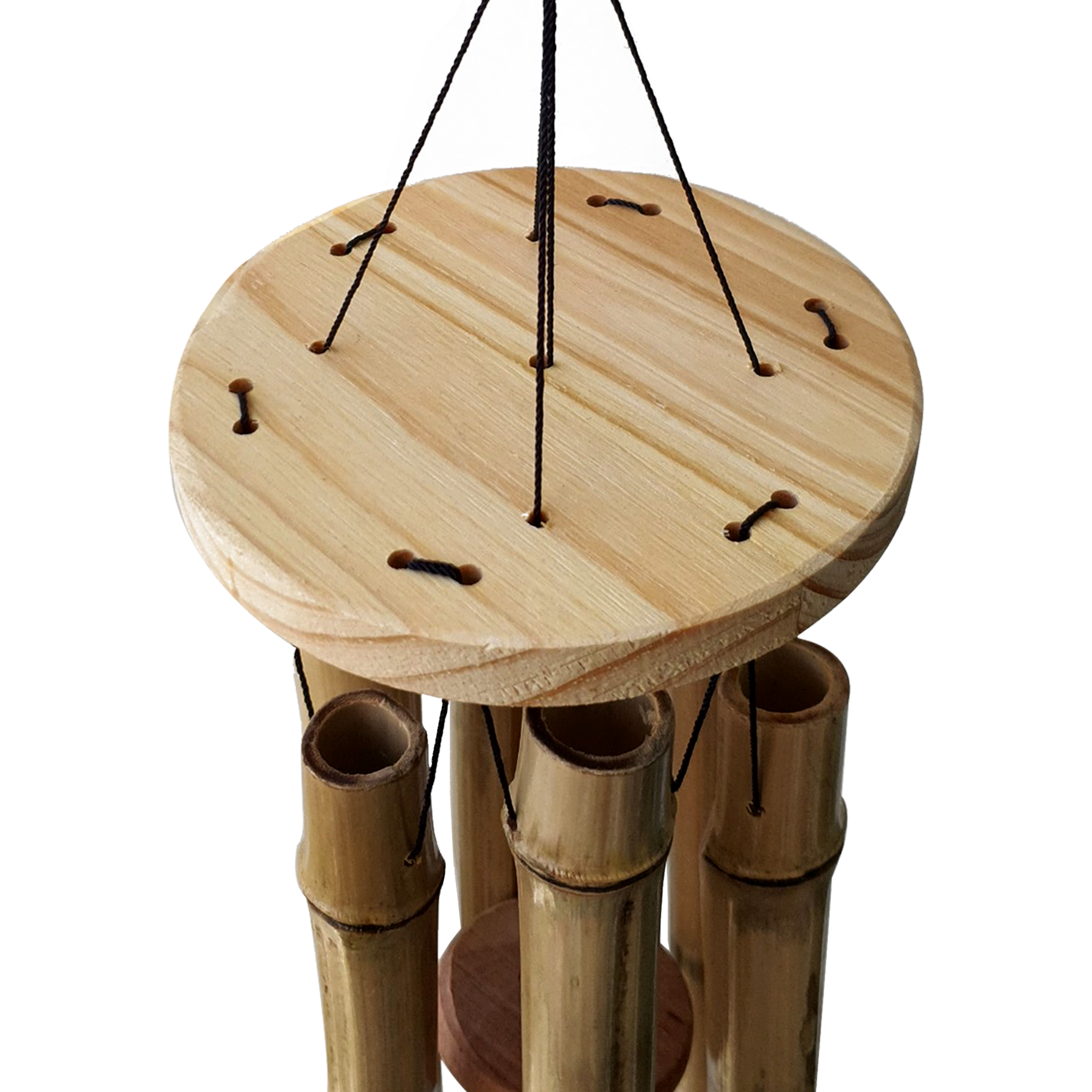 Một bộ chuông gió gồm 6 ống trúc, chóp là đĩa gỗ hình tròn. Âm thanh vang nhẹ nhàng của chuông gió tre trúc giúp chúng ta thư giãn, nạp lại năng lượng sau ngày dài làm việc.