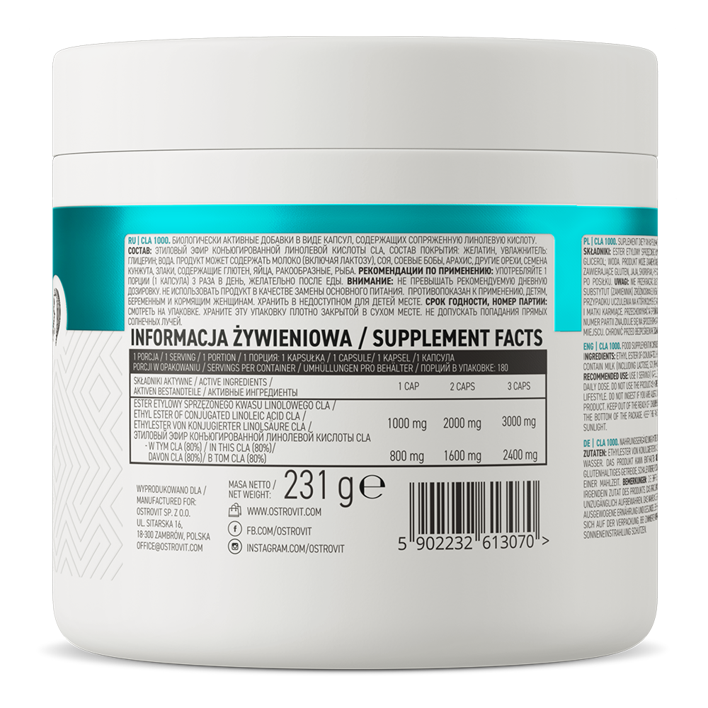 OstroVit CLA 1000 là thực phẩm bổ sung chất lượng cao nhất có chứa axit linoleic liên hợp (CLA). CLA có tác dụng rất tích cực đối với cơ thể con người. Nó cho thấy một hoạt động hỗ trợ sự phát triển của khối lượng cơ nạc và giúp đốt cháy các mô mỡ dư thừa.