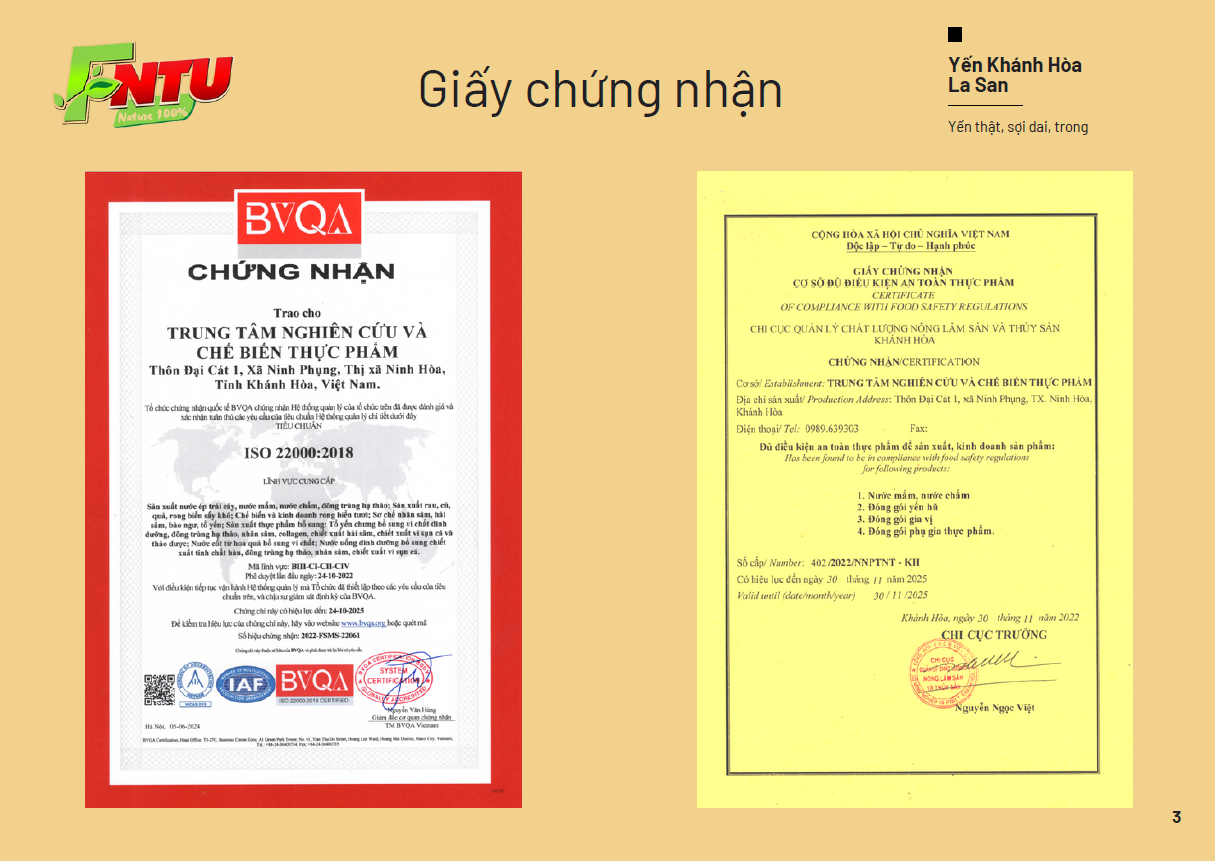 Yến Khánh Hòa La San Kids: được chế biến theo phương pháp truyền thống, kết hợp với công nghệ hiện đại trên dây chuyền thiết bị tiên tiến từ châu Âu. Điều này không chỉ giữ trọn vẹn hương vị tự nhiên mà còn bảo toàn tối đa các dưỡng chất quý giá có trong yến.