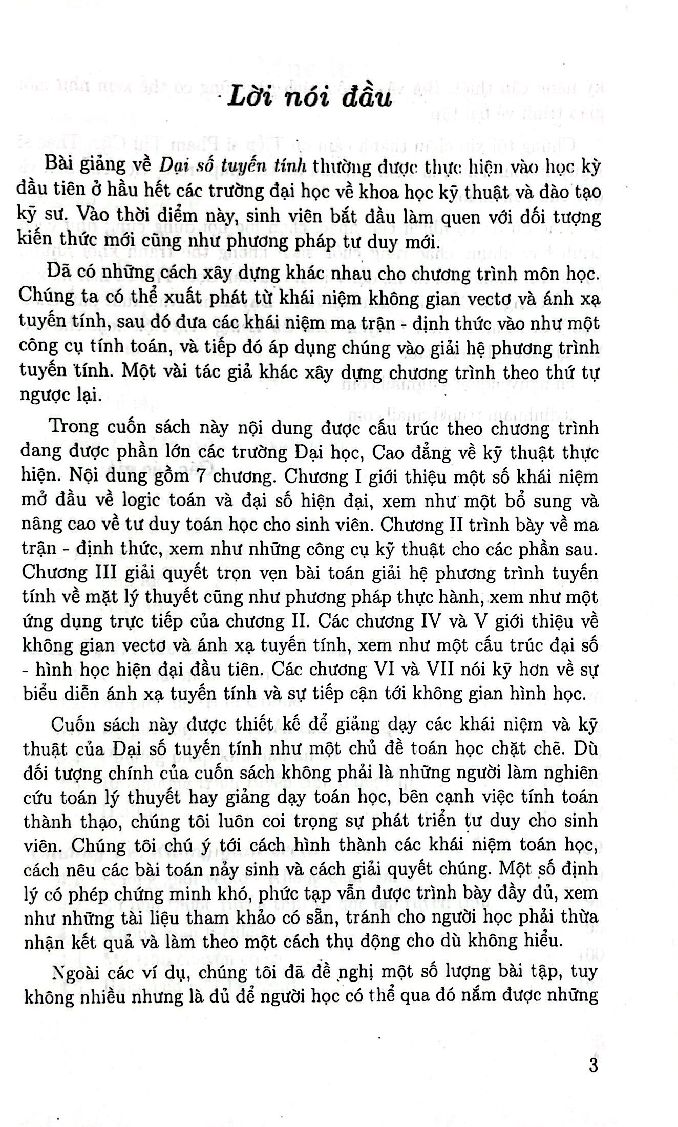 Cuốn sách này được thiết kế để giảng dạy các khái niệm và kỹ thuật của Đại số tuyến tính như một chủ đề toán học chặt chẽ. Dù đối tượng chính của cuốn sách không phải là những người làm nghiên cứu toán lý thuyết hay giảng dạy toán học, bên cạnh việc tính toán thành thạo, chúng tôi luôn coi trọng sự phát triển tư duy cho sinh viên. Chúng tôi chú ý tới cách hình thành các khái niệm toán học, cách nêu các bài toán nảy sinh và cách giải quyết chúng. Một số định lý có phép chứng minh khó, phức tạp vẫn được trình bày đầy đủ, xem như những tài liệu tham khảo có sẵn, tránh cho người học phải thừa nhận kết quả và làm theo một cách thụ động cho dù không hiểu.