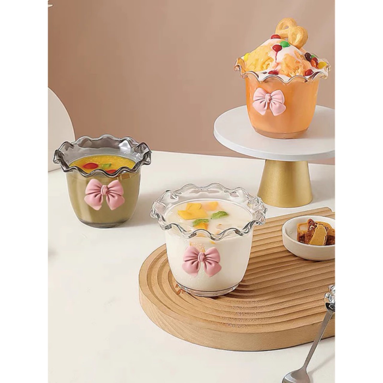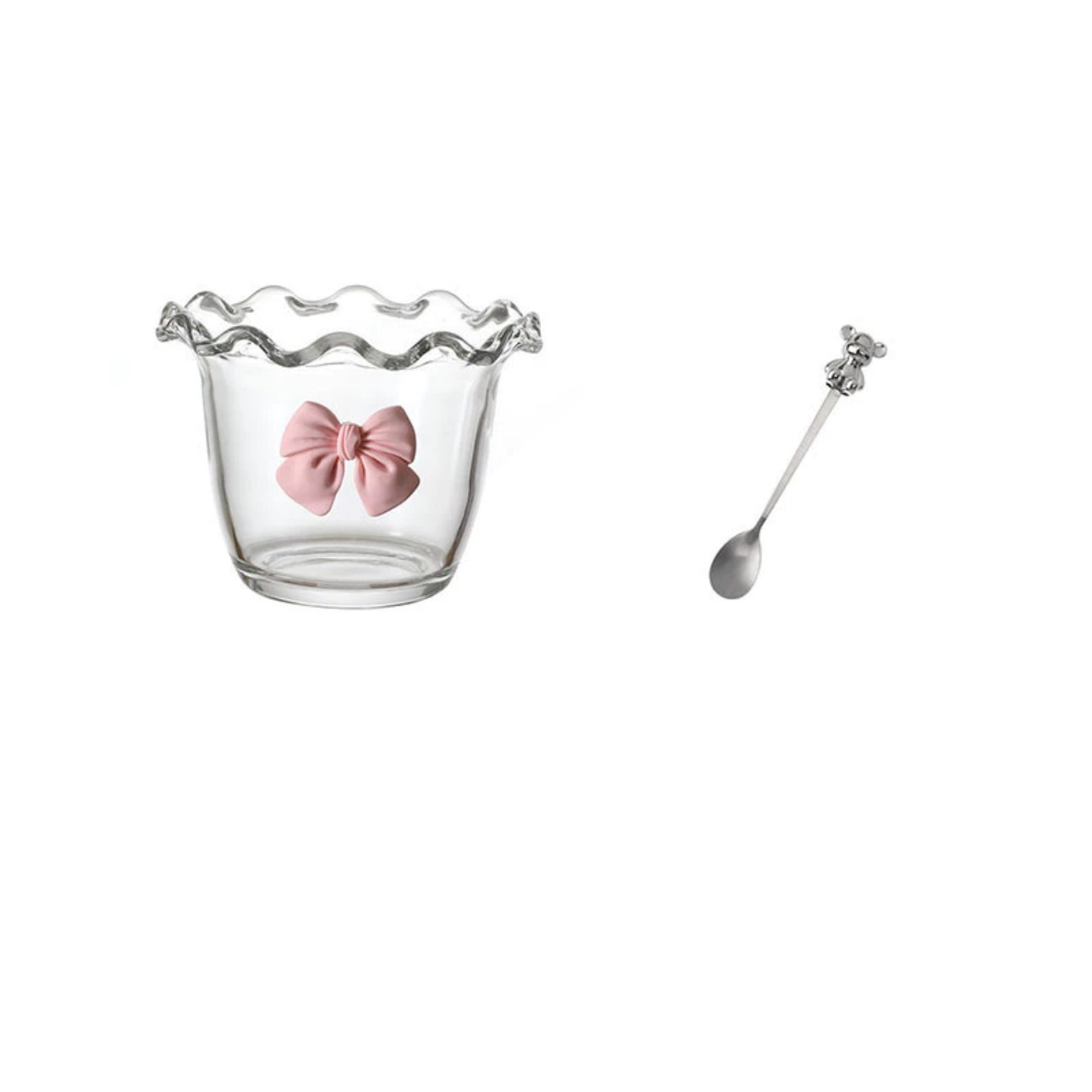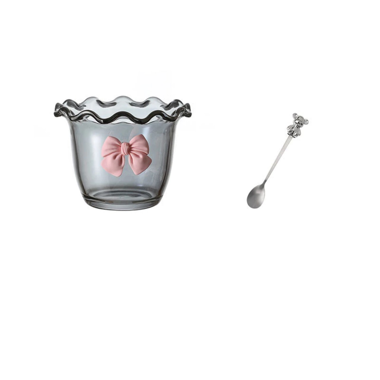 Cốc - Bát Thuỷ Tinh Viền Sóng Kèm Nơ và Thìa Gấu Siêu Xinh - Bát Ly Cốc Thuỷ Tinh To 450ml Ăn Sữa Chua Ngũ Cốc Chè Hoa Quả Cao Cấp Sang Trọng - Tặng Kèm Thìa