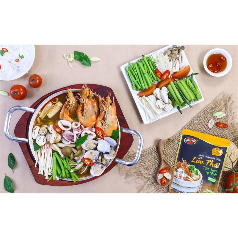 Nước dùng hoàn chỉnh Barona - Lẩu Thái , Tươi Ngon Tự Nhiên với hơn 70% thành phần Nước hầm xương và Chiết xuất Rau củ quả tươi được phối trộn cùng các loại gia vị đặc trưng tạo nên hương vị lẩu Thái chuẩn vị chua chua, cay cay của xứ sở Chùa Vàng khiến bao người mê mẩn. Thực hiện vô cùng nhanh chóng, tiên lợi & hợp vệ sinh, là sự lựa chọn tuyệt vời cho những buổi tiệc tùng của gia đình bạn.