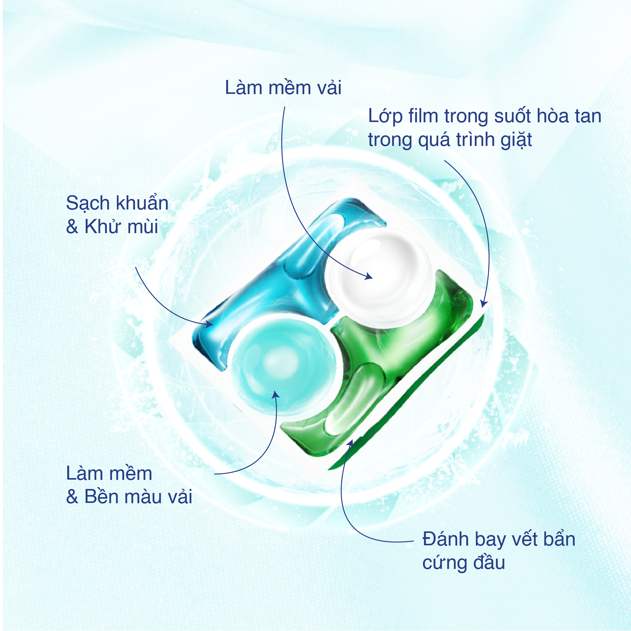 TẠI SAO LỰA CHỌN VIÊN GIẶT QUẦN ÁO thay thế các loại giặt tẩy thông thường? Đơn giản hóa việc giặt giũ chỉ với 1 sản phẩm 1 thao tác: - Đa năng: Tất cả trong 1 viên giặt chất tẩy vết bẩn, chất làm mềm vải, chất khử khuẩn- khử mùi, bảo vệ màu quần áo (tương tự sự kết hợp của nước giặt và nước xả) - Tiện lợi: Dùng được tới 7 kg quần áo chỉ với 1 viên; Dùng được cho cả máy giặt cửa trên và máy giặt cửa trước ; Dùng khi giặt bằng nước nóng/ lạnh đều có hiệu quả như nhau -Bảo vệ tuổi thọ máy giặt: Công thức ít bọt bảo vệ lồng giặt, gia tăng tuổi thọ máy giặt (sử dụng thêm viên tẩy lồng giặt định kỳ để làm sạch và bảo vệ lồng máy giặt) - Hiệu quả hơn bạn nghĩ: Chi phí tiết kiệm hơn so với 1 lần giặt thông thường - Đơn giản hóa danh sách mua sắm - Tiết kiệm