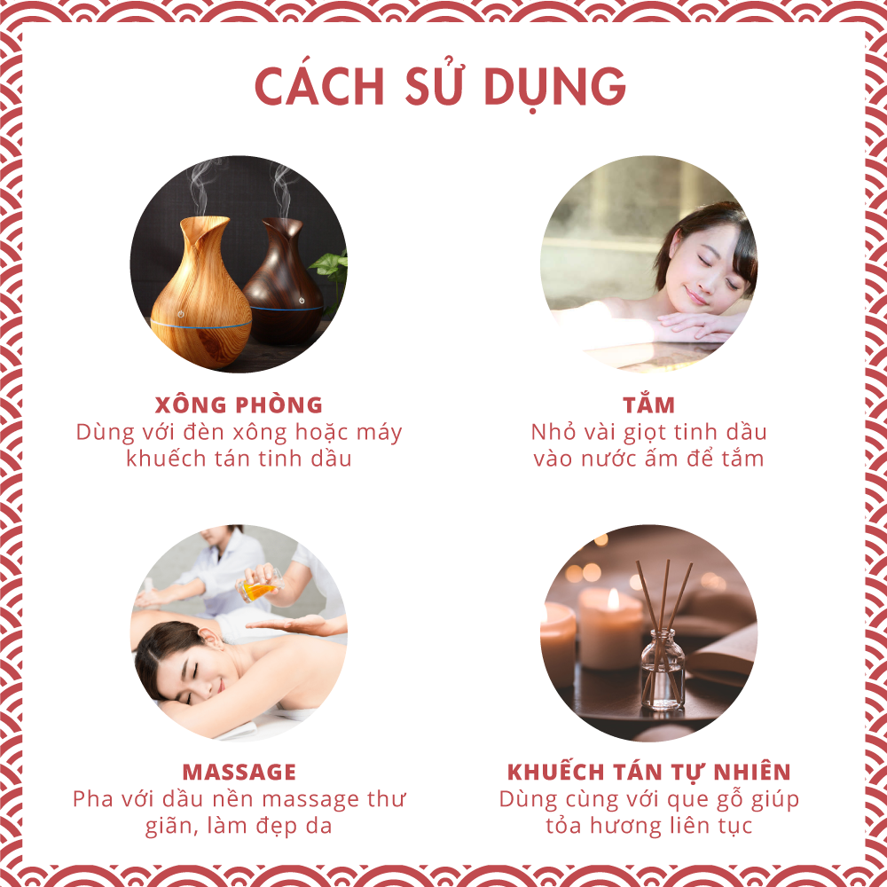 ► Khử mùi diệt khuẩn, làm thơm không gian: cho 3-5 giọt tinh dầu vào đèn xông giúp lan tỏa khắp gian phòng, làm sạch không khí. Có thể trộn các mùi với tỷ lệ 1:1:1 hoặc tỷ lệ khác tùy sở thích để có những trải nghiệm đặc biệt hơn.