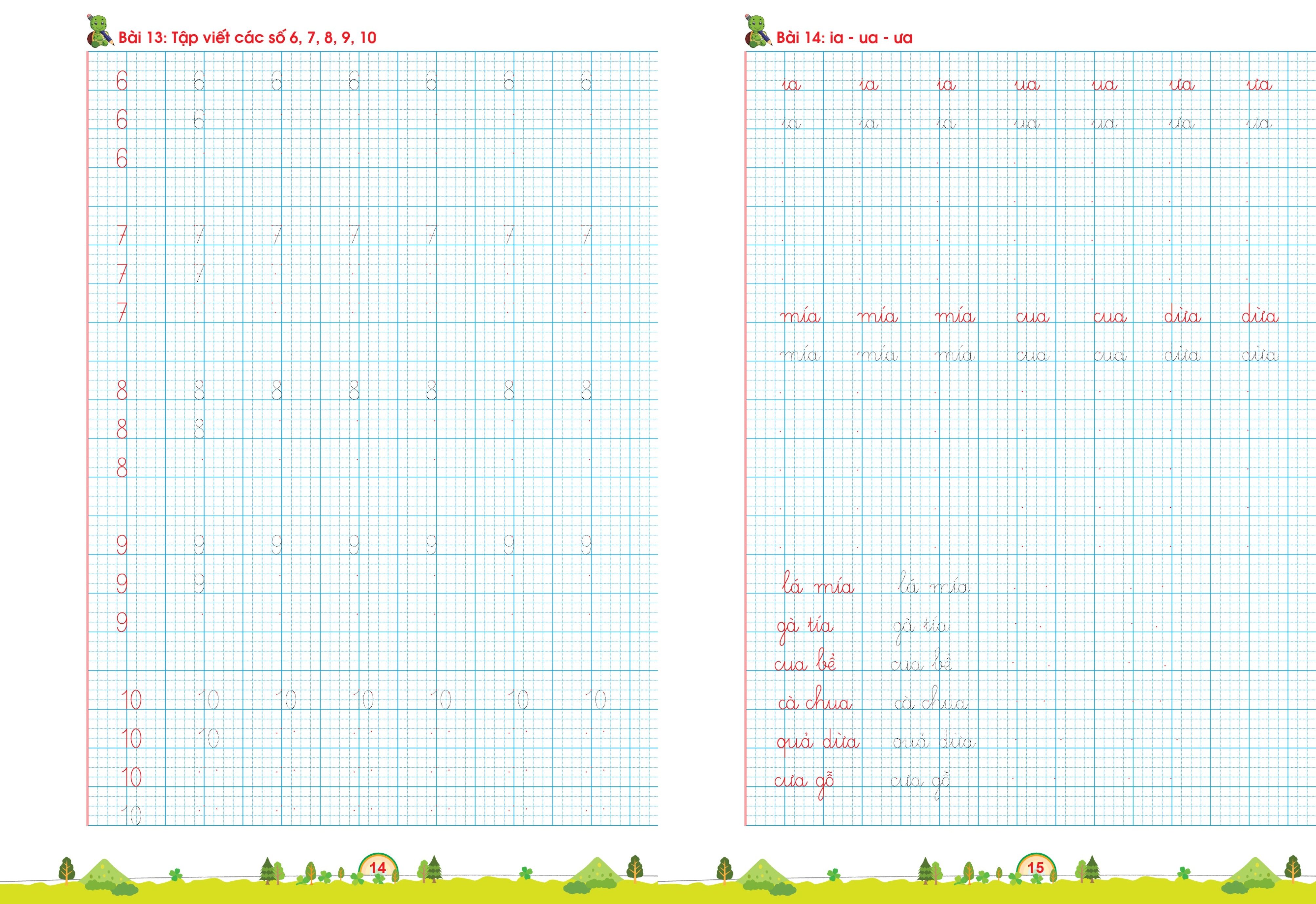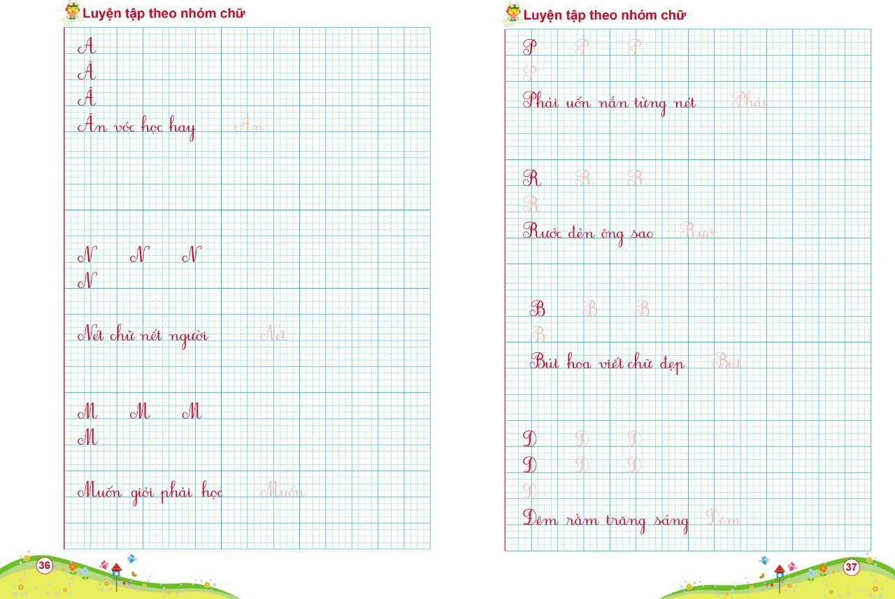- Phần 1: Luyện viết 29 chữ cái và 11 chữ ghép được sắp xếp lần lượt theo nhóm chữ có nét tương đồng. Mỗi chữ được thiết kế tập viết từ nét cơ bản, chấm mẫu điểm đặt bút giúp học sinh nắm bắt được quy trình viết dễ hơn, hiệu quả hơn.