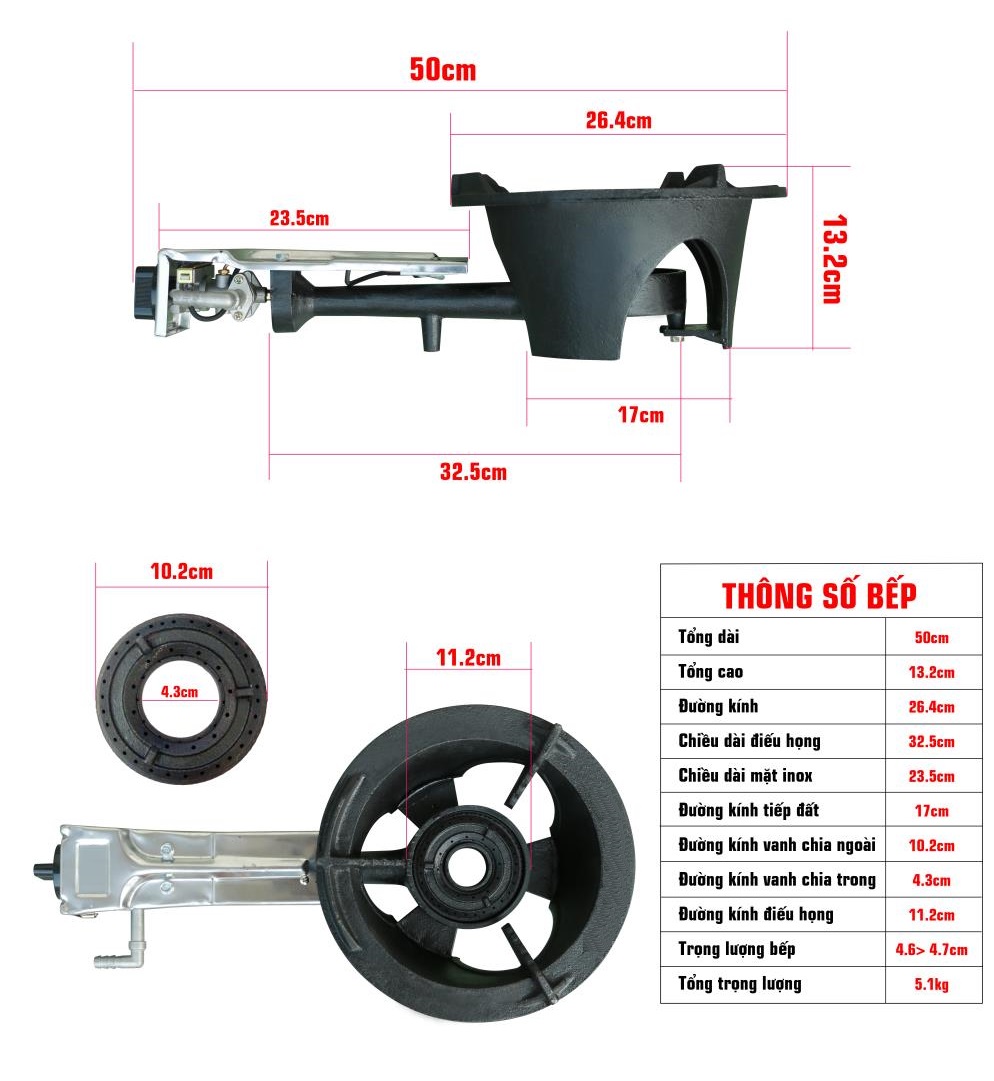 * Mặt kiếng cao cấp chịu lực, chịu nhiệt, thiết kế hoa văn sang trọng; - Thân bếp bằng inox, cao 100 mm; - Kiềng thép sơn tĩnh điện, có chắn gió; - Điếu loe