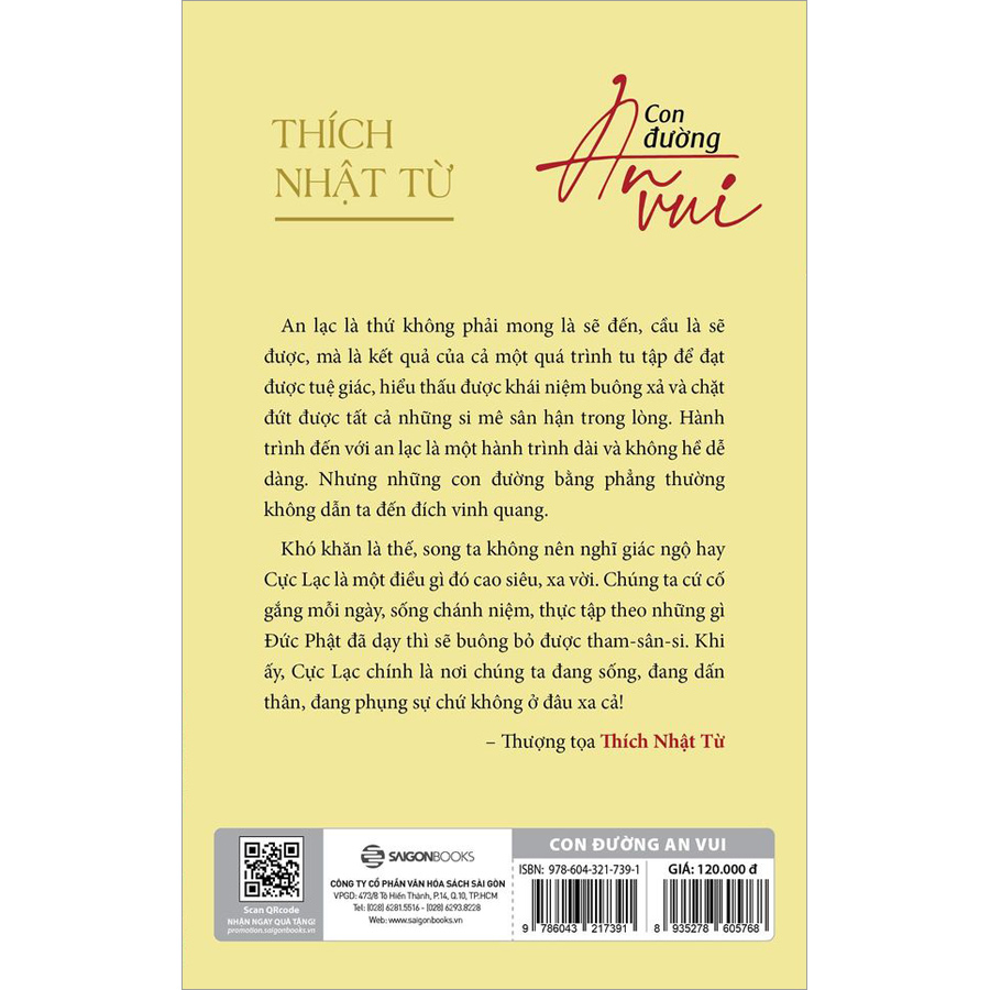 Đó là lý do tôi viết nên quyển sách Con đường an vui này – một quyển sách nói về hành trình tìm đến an vui dài lâu. Có thể những chia sẻ này chưa thực sự đầy đủ và trọn vẹn để trở thành cơ sở giúp một người có thể thực tập và đạt đến an lạc được ngay, nhưng tôi tin rằng, nếu chúng ta cùng tin vào chánh pháp, sẵn sàng học hỏi từ nhiều nguồn, dấn thân thực tập dựa trên tinh thần lời dạy của Đức Phật, và luôn vững vàng trước mọi thử thách để kiên trì trên hành trình tu học, thì chắc chắn, trong tương lai, ta sẽ chạm được đến an lạc đích thực.