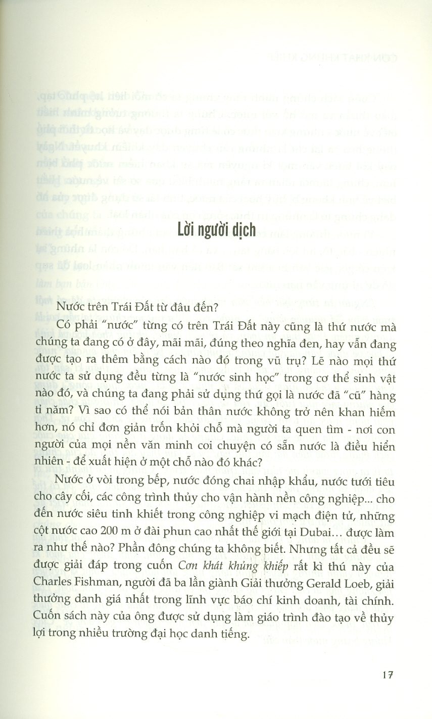 “Fishman, tác giả của cuốn sách bán chạy nhất, Hiệu ứng Wal-Mart (2006), giờ đây đã đem thiên phú của ông về những phép thống kê và kể chuyện vào cuốn sách đánh giá sinh động và vô giá về các nền chính trị, kinh tế, văn hóa về nước. Đầy tình cảm trong những mô tả vẻ đẹp và sự kì diệu của nước, nhưng cũng rất nghiêm khắc khi lí giải rằng nước mà giờ đây chúng ta đang có đều là nước chúng ta sẽ phải sử dụng mãi, và kỉ nguyên vàng của thứ nước dự dật, an toàn, và rẻ, sẽ sớm cáo Cuộc điều tra gây say mê của Fishman về nước làm nên nền tảng của một cuộc cách mạng dùng nước rất cần thiết” - Tạp chí Booklist