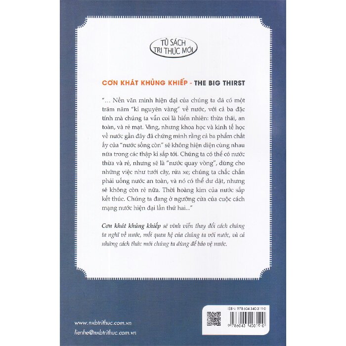 " Nền văn minh hiện đại của chúng ta đã có một trăm năm “kỉ nguyên vàng” về nước, với cả ba đặc tính mà chúng ta vẫn coi là hiển nhiên: thừa thãi, an toàn, và rẻ mạt. Vâng, nhưng khoa học và kinh tế học về nước gần đây đã chứng minh rằng cả ba phẩm chất ấy của “nước sống còn” sẽ không hiện diện cùng nhau nữa trong các thập kỉ sắp tới. Chúng ta có thể có nước thừa và rẻ, nhưng sẽ là “nước quay vòng, dùng cho những việc như tưới cây, rửa xe; chúng ta chắc chắn phải uống nước an toàn, và nó có thể dư dật, nhưng sẽ không còn rẻ nữa. Thời hoàng kim của nước sắp kết thúc. Chúng ta đang ở ngưỡng cửa của cuộc cách mạng nước hiện đại lần thứ ”