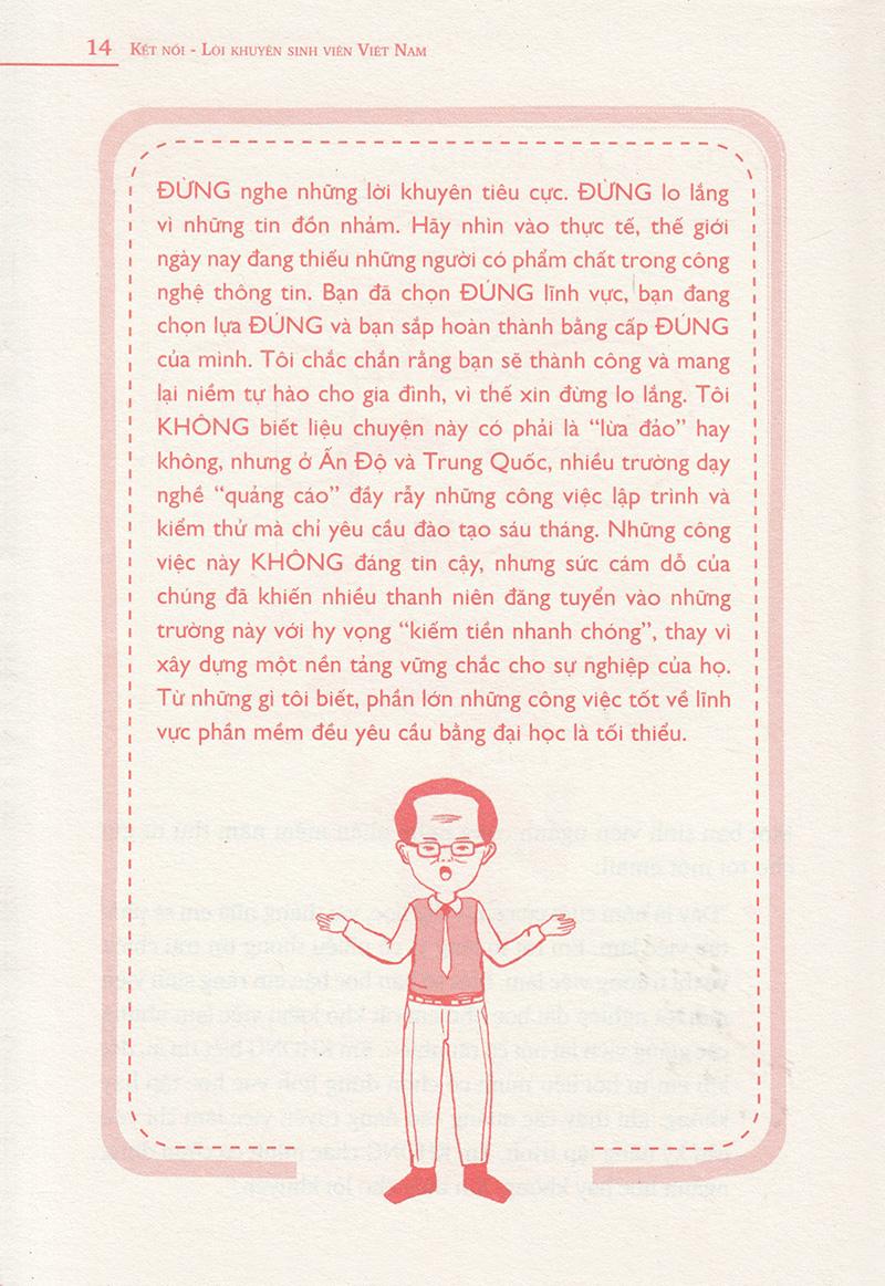 Những bài viết trong cuốn sách này rất phù hợp với các bạn trẻ Việt Nam, cung cấp cho các bạn những kiến thức cần thiết để vững bước trên hành trình gây dựng sự nghiệp cho riêng mình. Mong rằng các bạn tìm thấy ở đây câu trả lời cho những khó khăn đang gặp phải, cũng hy vọng các bạn tìm thấy tương lai của mình, góp phần cống hiến cho tương lai đất nước. Cuốn sách “Kết Nối” sẽ mang lại cho các bạn sự chuẩn bị đó. Nếu bạn là sinh viên sắp, hoặc mới tốt nghiệp, đang trên con đường tìm kiếm cho mình một công việc không chỉ để nuôi sống bản thân mà còn nuôi dưỡng những khát khao, hãy đi theo hành trình của cuốn sách này.