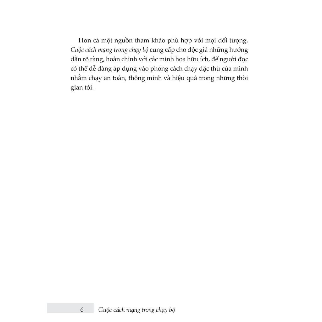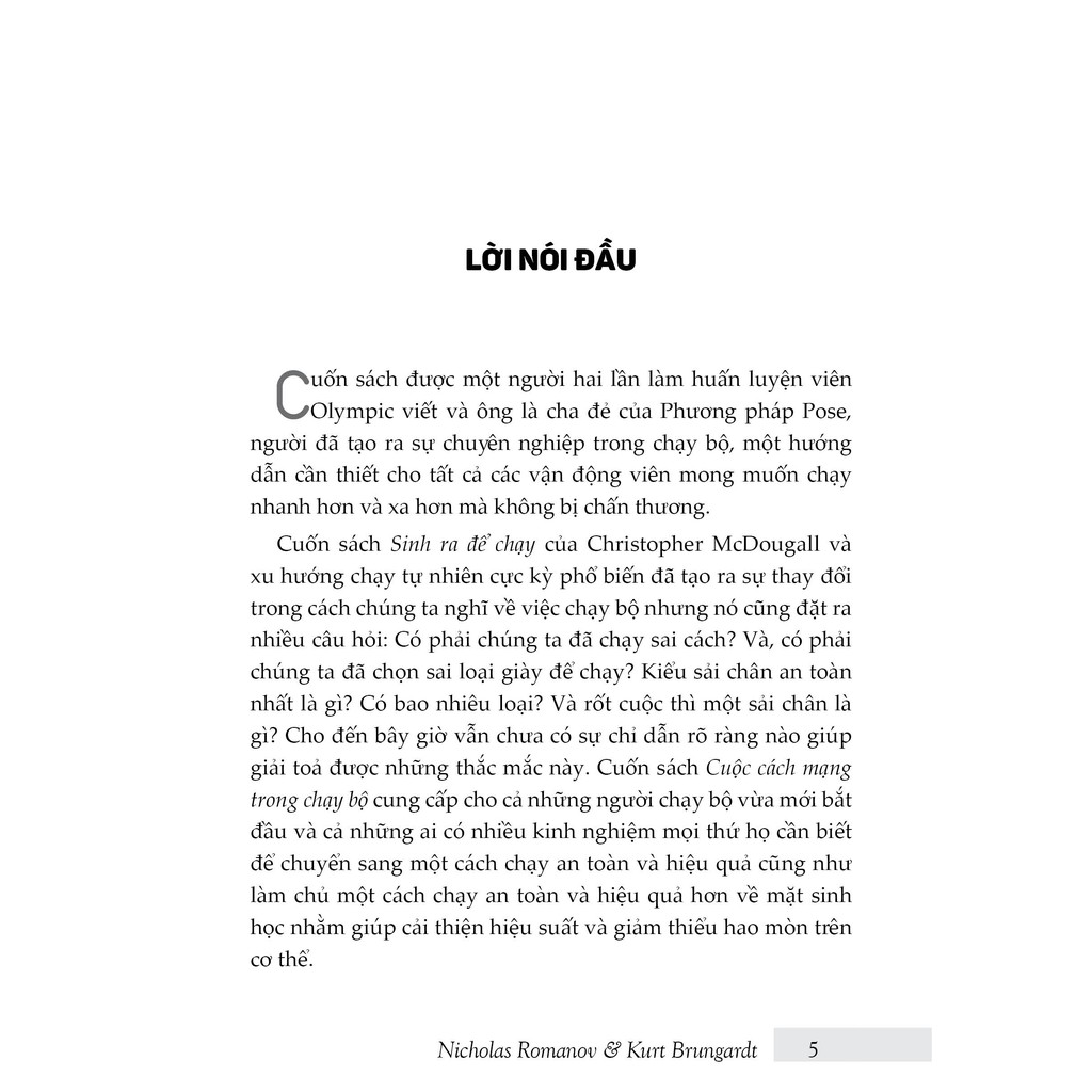 Cuộc Cách Mạng Trong Chạy Bộ GIỚI THIỆU SÁCH: Có phải chúng ta đã chạy sai cách? Có phải chúng ta đã chọn sai loại giày để chạy? Kiểu sải chân an toàn nhất là gì? Có bao nhiêu loại? Và rốt cuộc thì một sải chân là gì? Cho đến bây giờ vẫn chưa có sự chỉ dẫn rõ ràng nào giúp giải toả được những thắc mắc này. Cuốn sách Cuộc Cách Mạng Trong Chạy Bộ cung cấp cho cả những người chạy bộ vừa mới bắt đầu và cả những ai có nhiều kinh nghiệm mọi thứ họ cần biết để chuyển sang một cách chạy an toàn và hiệu quả cũng như làm chủ một cách chạy an toàn và hiệu quả hơn về mặt sinh học nhằm giúp cải thiện hiệu suất và giảm thiểu hao mòn trên cơ thể. Cuộc Cách Mạng Trong Chạy Bộ được một người hai lần làm huấn luyện viên Olympic viết và ông là cha đẻ của Phương pháp Pose, người đã tạo ra sự chuyên nghiệp trong chạy bộ, một hướng dẫn cần thiết cho tất cả các vận động viên mong muốn chạy nhanh hơn và xa hơn mà không bị chấn thương. Hơn cả một nguồn tham khảo phù hợp với mọi đối tượng, Cuộc Cách Mạng Trong Chạy Bộ cung cấp cho độc giả những hướng dẫn rõ ràng, hoàn chỉnh với các minh họa hữu ích, để người đọc có thể dễ dàng áp dụng vào phong cách chạy đặc thù của mình nhằm chạy an toàn, thông minh và hiệu quả trong những thời gian tới.