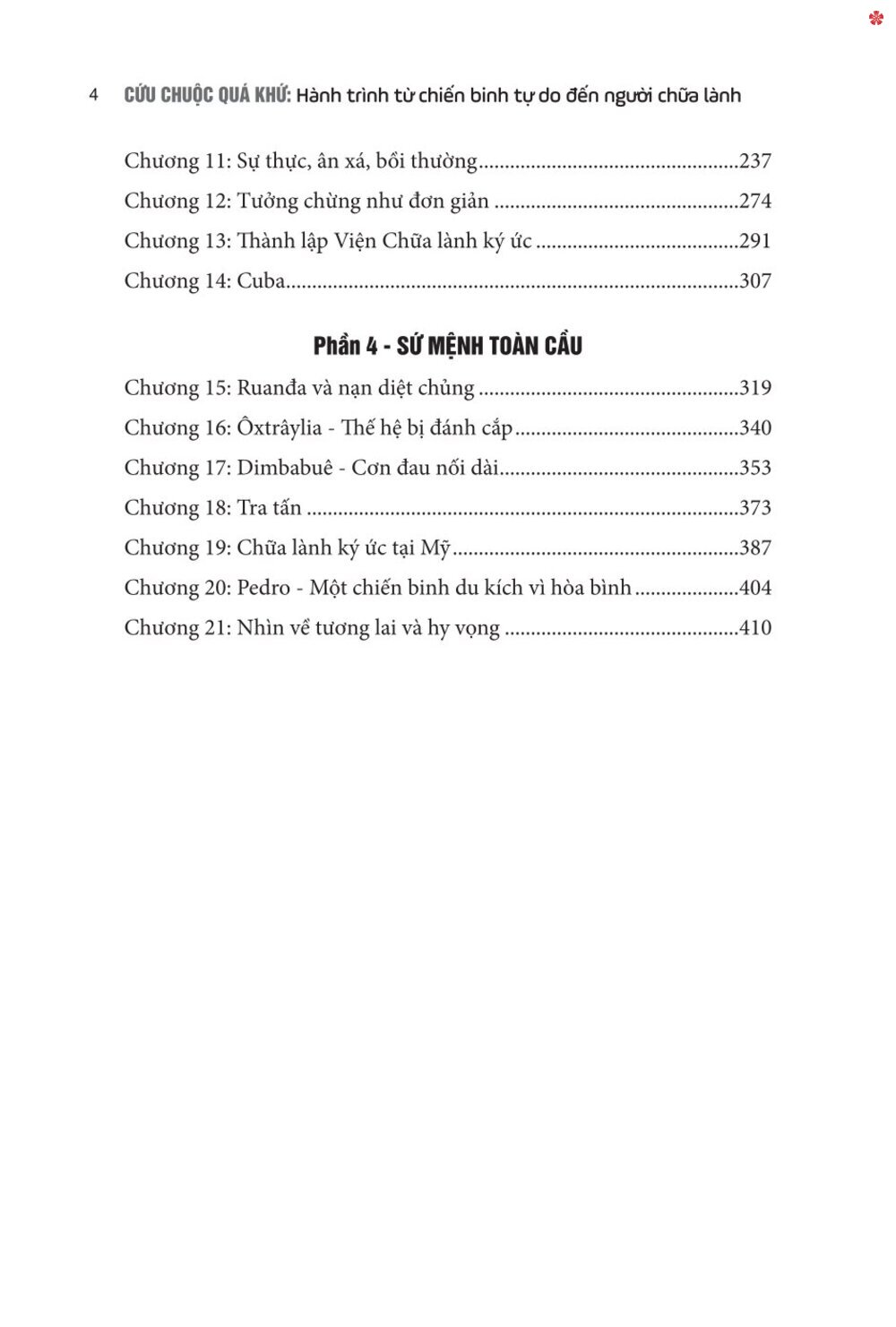Cuốn sách gồm 4 phần với 21 chương: Phần 1: Vụ đánh bom và hậu quả; Phần 2: Chiến binh tự do; Phần 3: Trở thành người chữa lành; Phần 4: Sứ mệnh toàn cầu