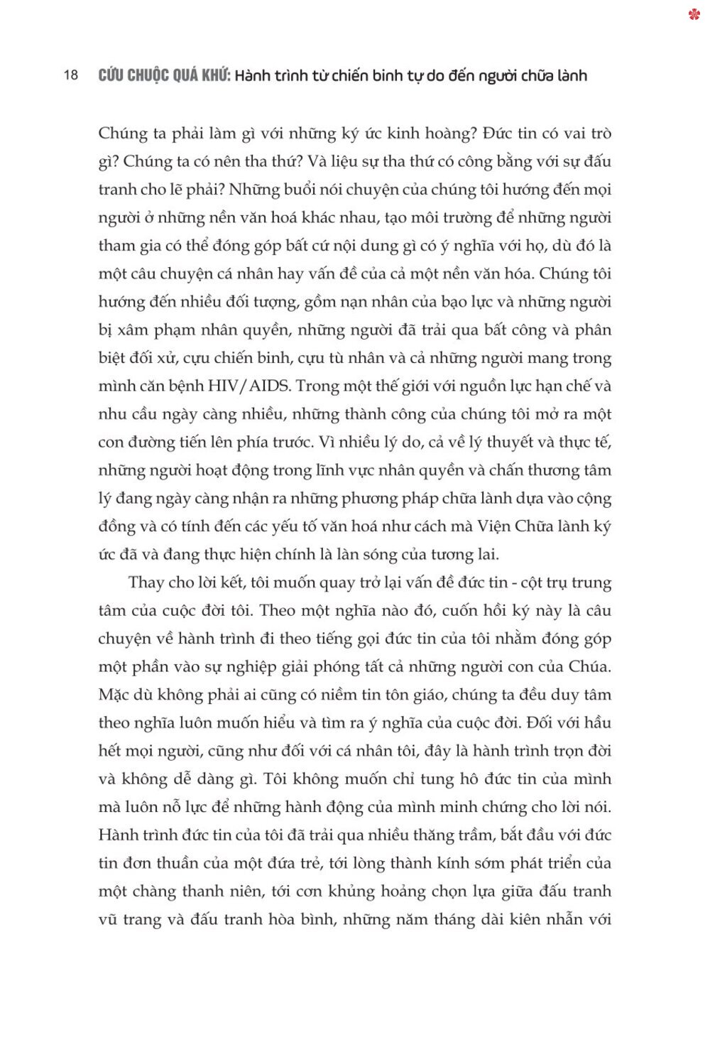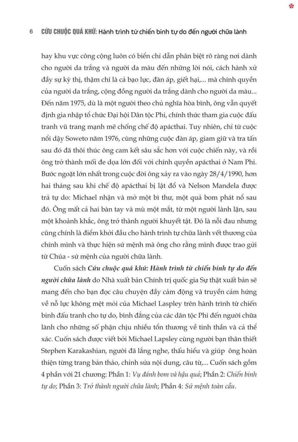 Cuốn sách Cứu chuộc quá khứ: Hành trình từ chiến binh tự do đến người chữa lành do Nhà xuất bản Chính trị quốc gia Sự thật xuất bản sẽ mang đến cho bạn đọc câu chuyện đầy cảm động và truyền cảm hứng về nỗ lực không mệt mỏi của Michael Laspley trên hành trình từ chiến binh đấu tranh cho tự do, bình đẳng của các dân tộc Phi đến người chữa lành cho những số phận chịu nhiều tổn thương về tinh thần và cả thể xác.