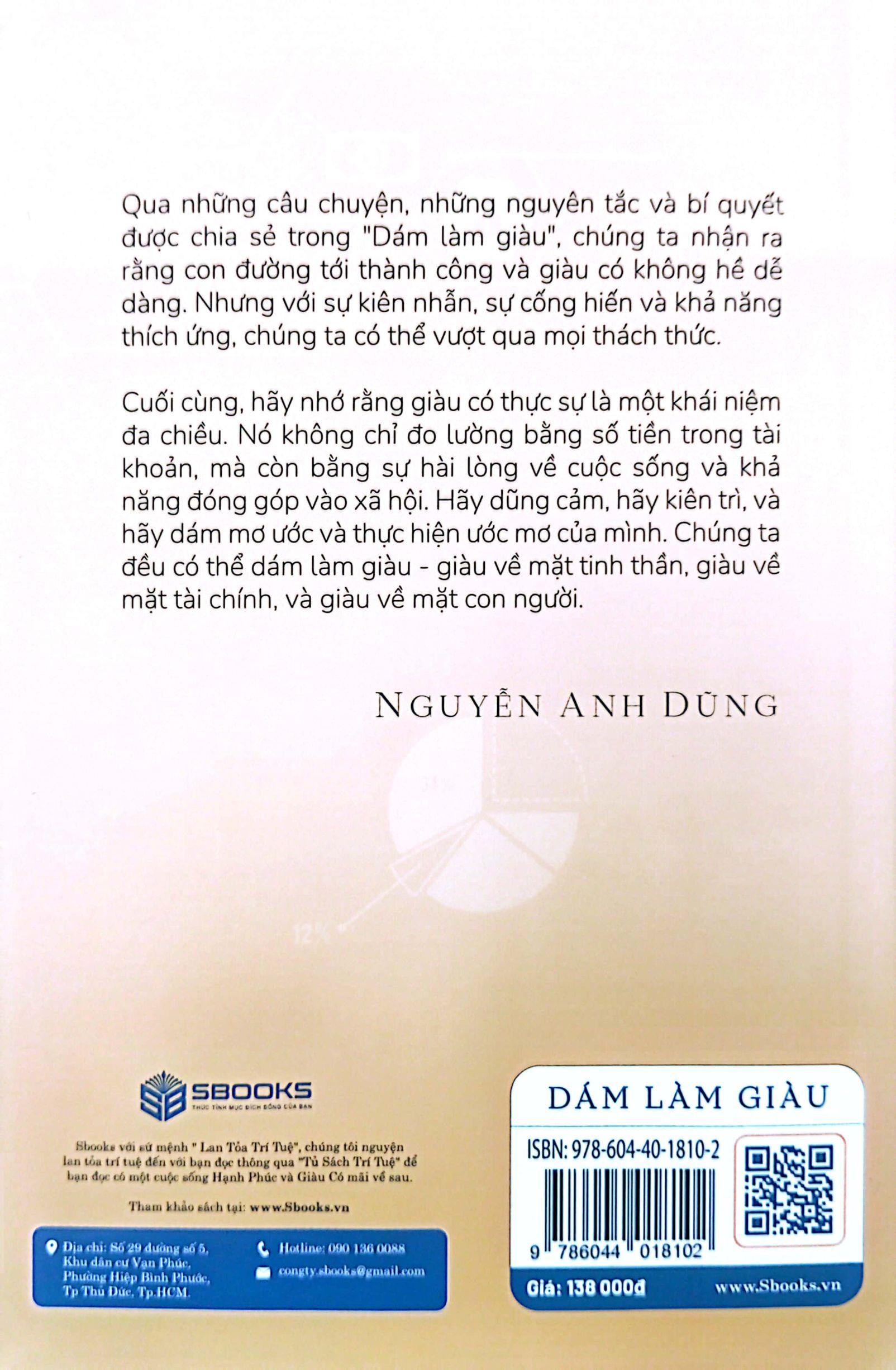 Bạn nghĩ đến điều gì khi đọc cuốn sách “Dám làm giàu”? Cuốn sách dạy cách kiếm tiền nhanh chóng ư? Hay dạy cách mua - bán để mau giàu? Không lẽ nó nói về cách đầu tư mạo hiểm? Hoàn toàn không phải!!