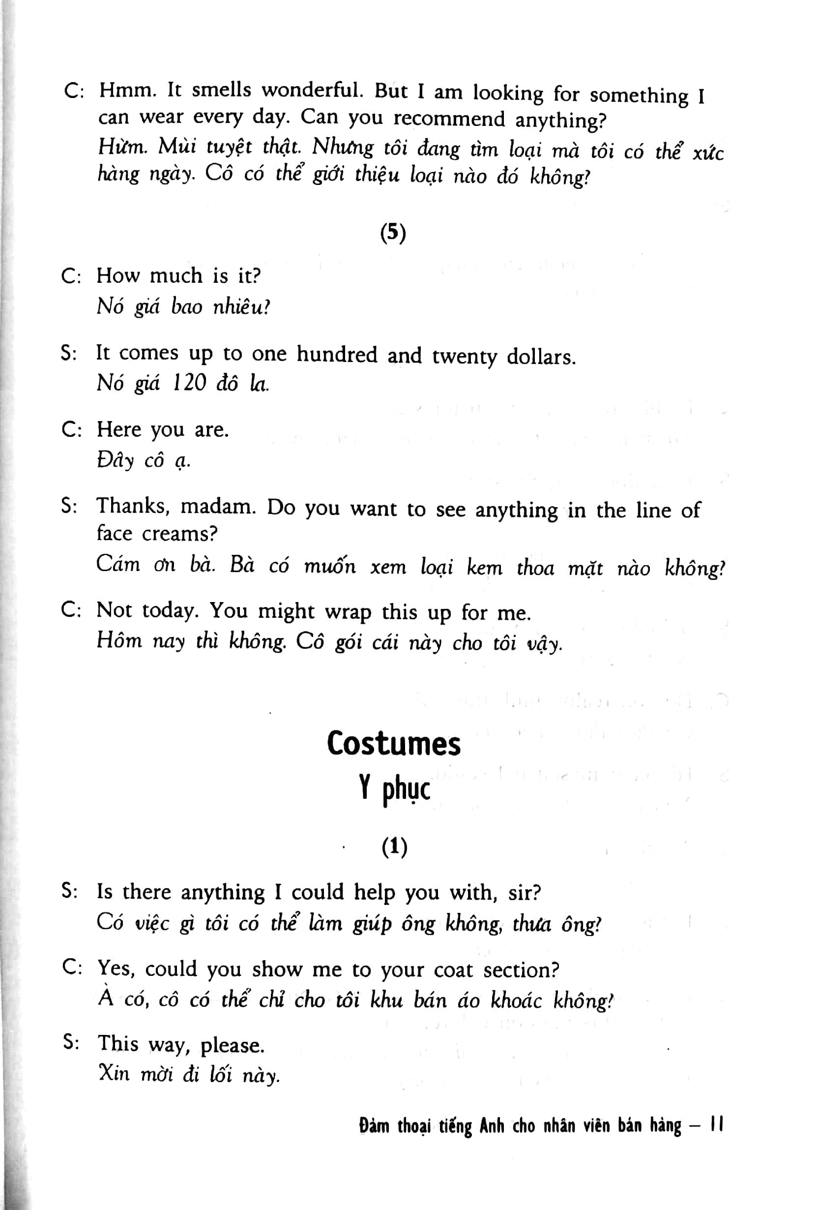 Sách sẽ giúp người học thành thạo ngay những câu giao tiếp cơ bản trong ngành để có thể làm việc hay giao tiếp với người nước ngoài trong buôn bán. Các đoạn hội thoại được sắp xếp theo những vấn đề riêng liên quan tới ngành bán hàng giúp người học có thể tìm và nói dễ dàng vì có cả phiên âm tiếng Anh và tiếng Việt.