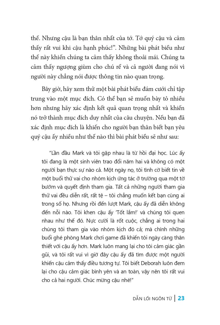 Nghệ thuật kể chuyện không chỉ để khuấy động không khí cho đám đông mà còn là công cụ hữu ích cho cuộc sống. Ví dụ khi bạn đang tham dự một cuộc họp kinh doanh, một câu chuyện sẽ giúp bạn nhấn mạnh quan điểm của mình hơn rất nhiều; một câu chuyện cũng rất cần thiết để kêu gọi tình nguyện viên cho một tổ chức. Cho dù bạn đang kể chuyện cho bạn bè, sếp, khách hàng hay thậm chí một người xa lạ, quyển sách “Dẫn lối ngôn từ” cũng sẽ giúp ích cho bạn. Bạn sẽ nhận ra rằng: Đúng, bạn có thể kể chuyện.