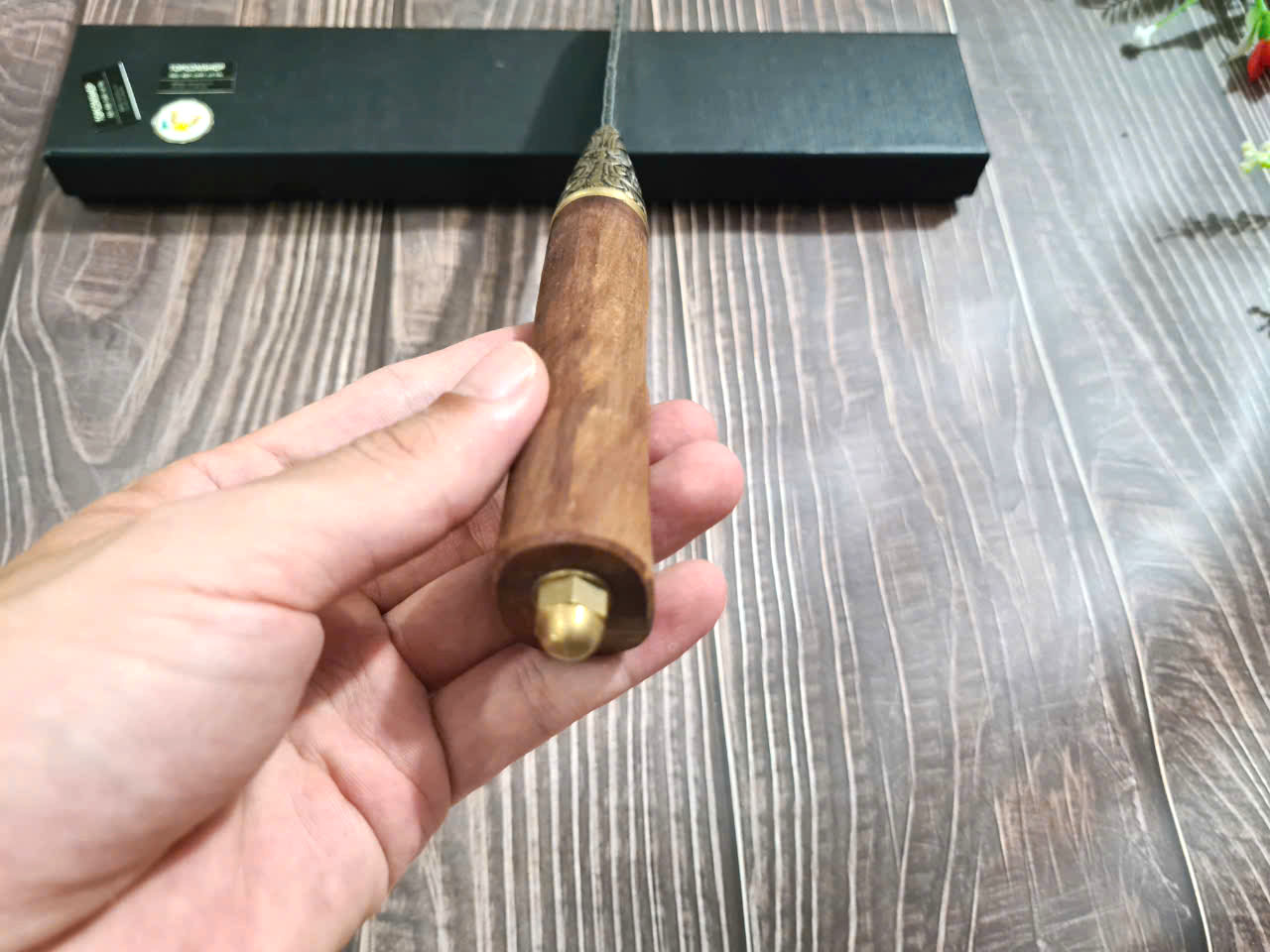 Chất liệu tay cầm: gỗ cẩm lai, khâu và chuôi cuối dao bằng đồng thau