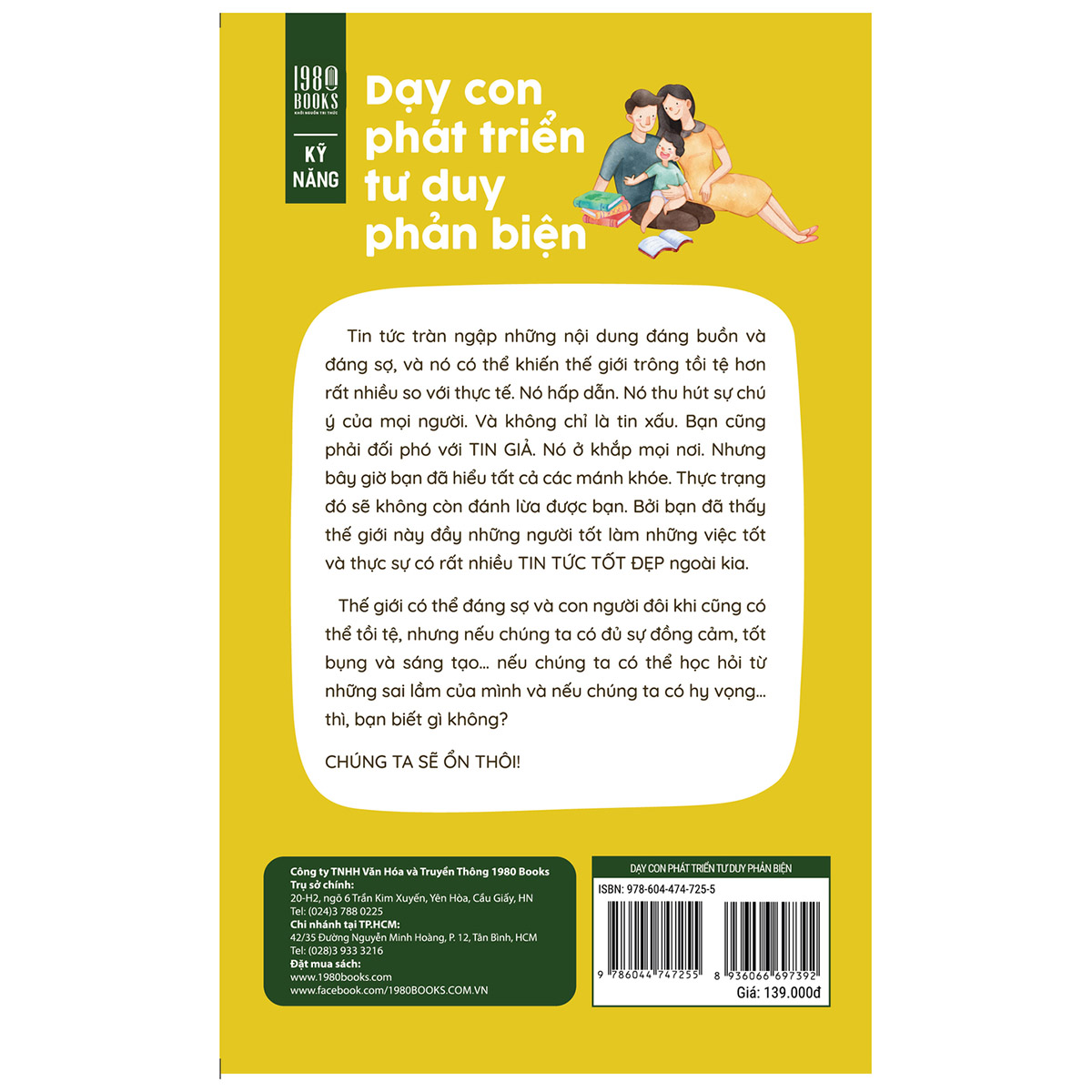 Cuốn sách “Dạy con phát triển tư duy phản biện” sẽ hướng dẫn các bố mẹ dạy con về tư duy, kỹ năng phản biện đúng. Đó chính là đưa những câu hỏi cụ thể để loại bỏ tin giả, tin xấu và tìm kiếm những nguồn thông tin đáng tin cậy.