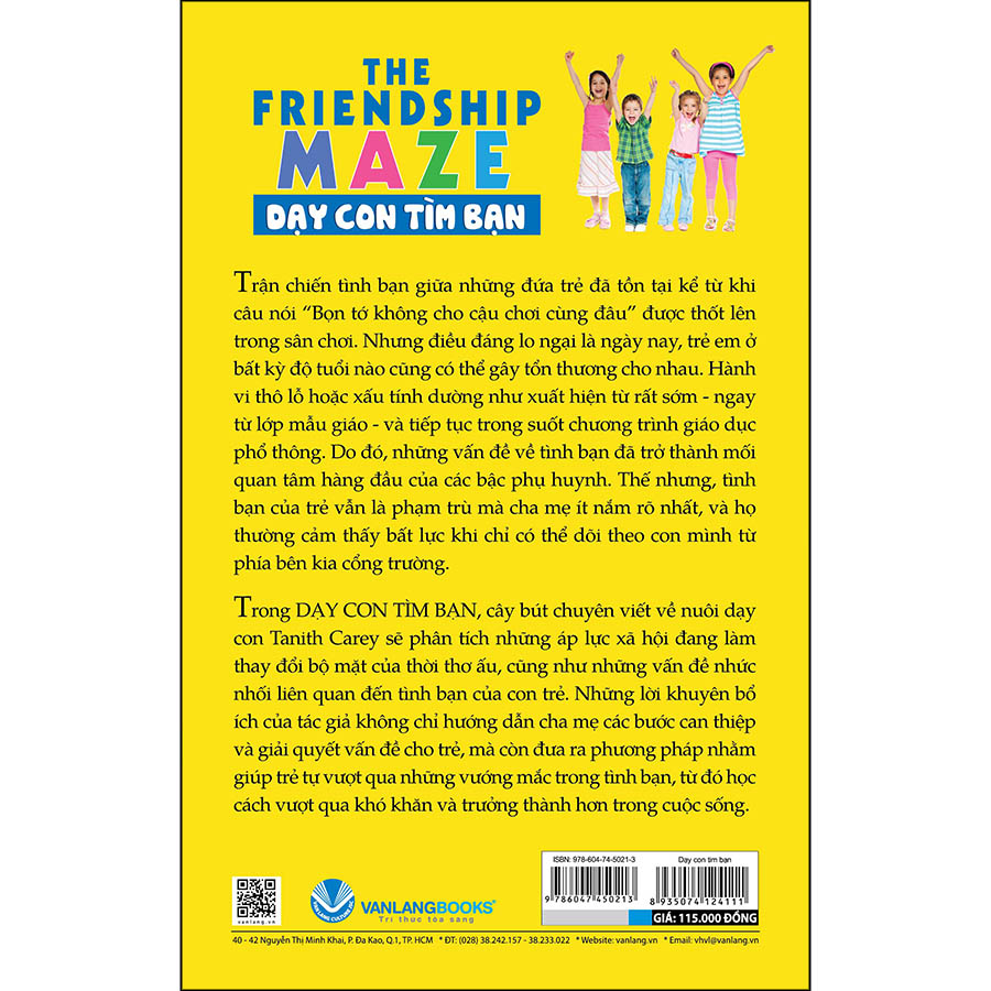 Trong DẠY CON TÌM BẠN, cây bút chuyên viết về nuôi dạy con Tanith Carey sẽ phân tích những áp lực xã hội đang làm thay đổi bộ mặt của thời thơ ấu, cũng như những vấn đề nhức nhối liên quan đến tình bạn của con trẻ. Những lời khuyên bổ ích của tác giả không chỉ hướng dẫn cha mẹ các bước can thiệp và giải quyết vấn đề cho trẻ, mà còn đưa ra phương pháp nhằm giúp trẻ tự vượt qua những vướng mắc trong tình bạn, từ đó học cách vượt qua khó khăn và trưởng thành hơn trong cuộc sống.