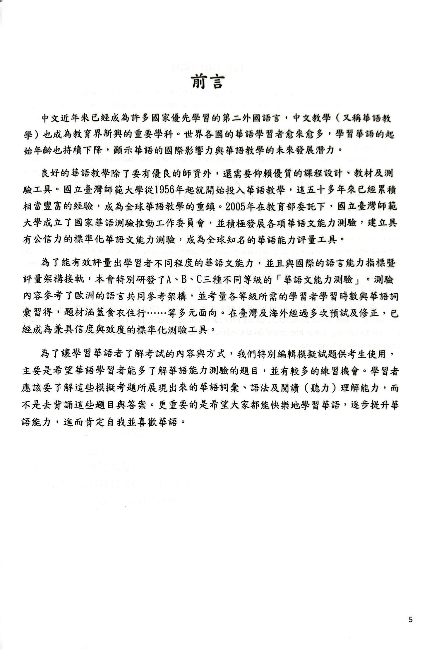 Để việc dạy học đạt hiệu quả thì ngoài đội ngũ giáo viên giỏi, cần phải có giáo trình và công cụ kiểm tra chất lượng cao. Tiếng Hoa bắt đầu được giảng dạy tại Đại học Sư phạm Đài Loan từ năm 45 dân quốc (năm 1956). Được sự ủy thác của Bộ Giáo dục, năm 2005, Đại học Sư Phạm Đài Loan đã thành lập Ủy ban Công tác thúc đẩy Kỳ thi Hoa ngữ, tích cực phát triển các bài kiểm tra năng lực tiếng Hoa nhằm thiết kế một kỳ thi năng lực Hoa ngữ có uy tín và được biết đến trên toàn cầu. Để có một công cụ đánh giá chính xác năng lực tiếng Hoa của người học và tương thích với Khung tham chiếu trình độ ngôn ngữ chung châu Âu, chúng tôi đã chú tâm nghiên cứu và triển khai Kỳ thi năng lực Hoa ngữ theo ba nhóm A, B, C. Nội dung kiểm tra được biên soạn bằng cách tham khảo số tiết học và sự phát triển năng lực Hoa ngữ của người học, đề cập đến nhiều khía cảnh như ăn, mặc, ở, đi lại, học hành, giải trí. Tuy nhiên, những bài thi này được thiết kế chủ yếu dành riêng cho những người đã học tiếng Hoa trên sáu tháng và có lẽ hơi khó đối với những người mới học.