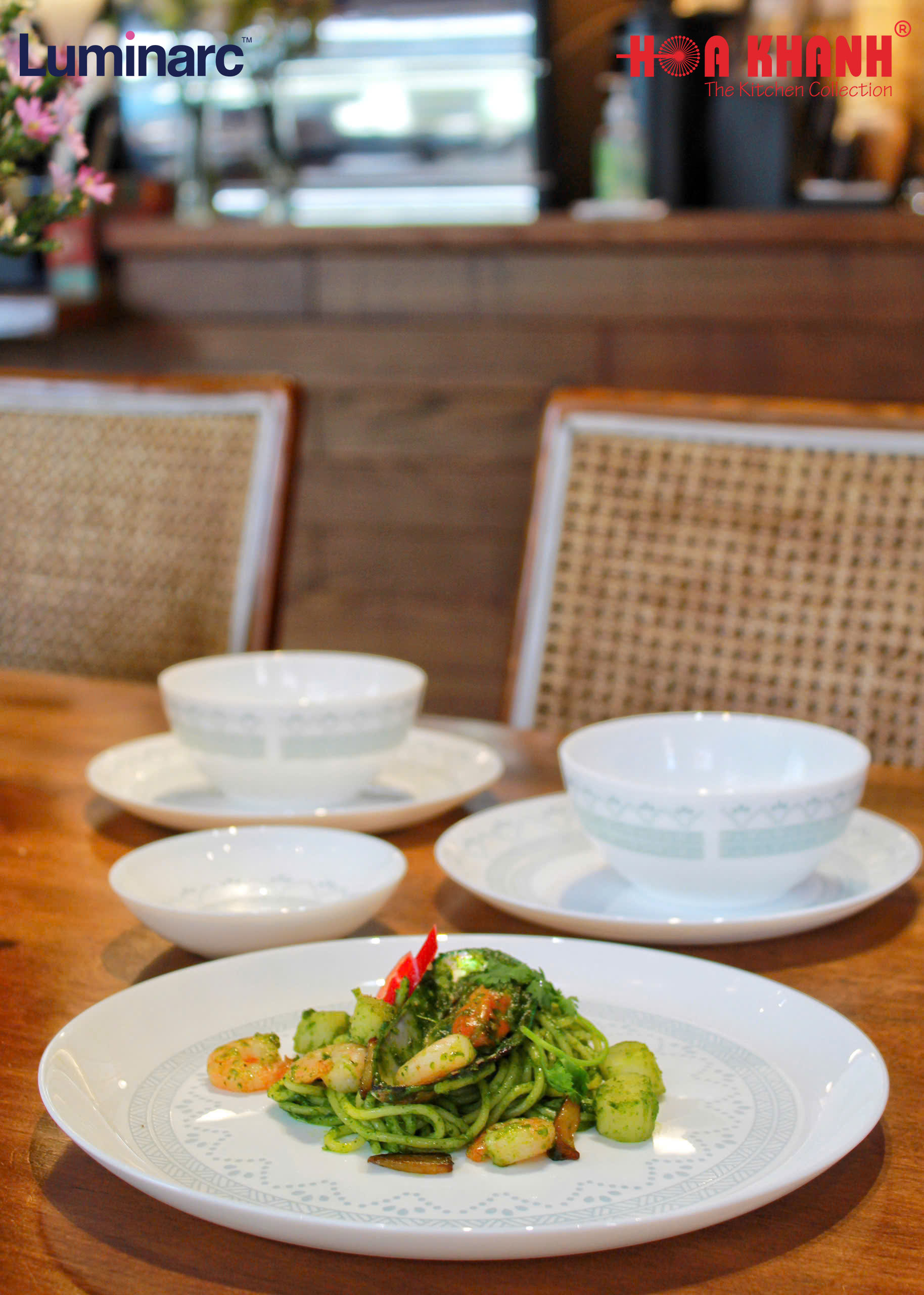 Đĩa thủy tinh lum.inar.c với hoạt tiết xanh nhạt đối xứng lặp lại đều đặn, đường kính 19cm, phù hợp để đựng những món xào, chiên,... luôn có mặt trong các bữa ăn gia đình hoặc trên các bàn tiệc của nhà hàng, khách sạn,...