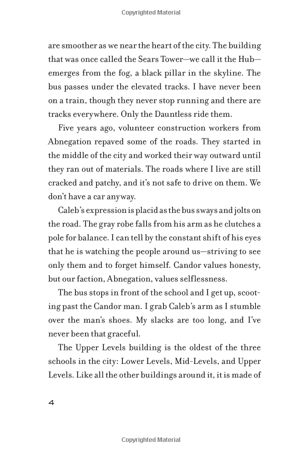 Roth: All the advantages I see only seem like advantages to me because I live in our current society. For example, the members of their society don’t focus on certain things: race, religion, sexual orientation, political affiliation, etc. I mean, a world in which you look different from the majority and no one minds? That sounds good to me. But when I think about it more, I realize that they’re doing the exact same thing we do, but with different criteria by which to distinguish ourselves from others. Instead of your skin color, it’s the color of your shirt that people assess, or the results of your aptitude test. Same problem, different system.