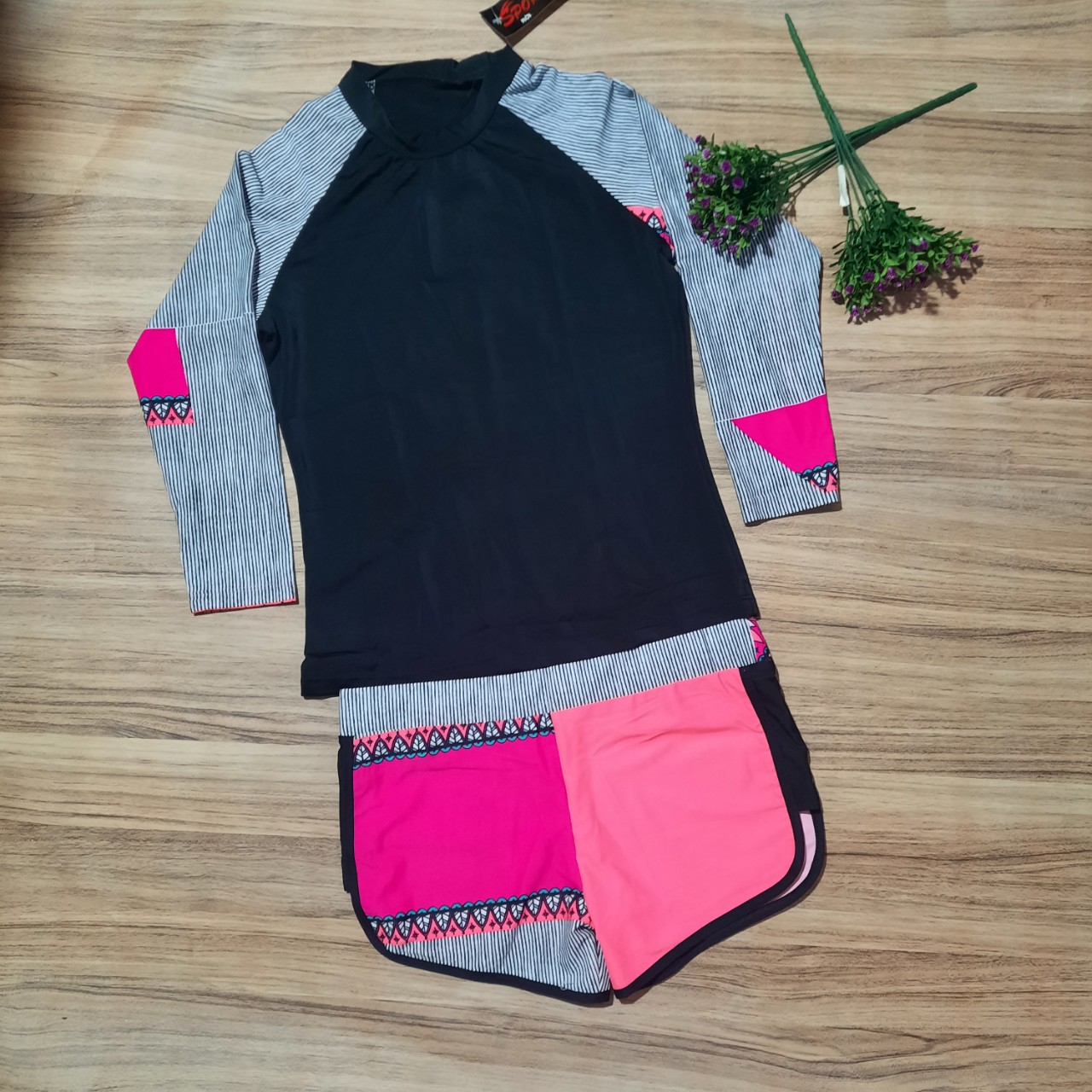 - Mẫu đồ bơi mới nhất cho các bạn nữ thích sự trẻ trung kín đáo mà vẫn thu hút khi đi biển, đi bơi. - Áo dáng ngắn tay phối hoạ tiết trẻ khoẻ,