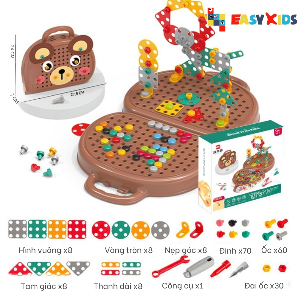 Đồ Chơi Lắp Ráp Lắp Ghép Vali Kỹ Sư Cho Bé, Đồ Chơi Nhập Vai Kèm Khoan Điện, Vặn Ốc Vít   GIỚI THIỆU SẢN PHẨM: Chào mừng đến với thế giới sáng tạo và khám phá của đồ chơi lắp ráp lắp ghép vali kỹ sư cho bé! Đây là một sản phẩm đồ chơi giáo dục tuyệt vời, giúp bé yêu phát triển tư duy logic và kỹ năng thực hành từ nhỏ. Đồ chơi lắp ráp lắp ghép vali kỹ sư không chỉ là một bộ đồ chơi giải trí mà còn là công cụ hữu ích để bé tạo ra và khám phá những công trình sáng tạo của riêng mình. Với các bộ phận lắp ghép đa dạng như ốc vít, miếng lắp ráp hình tròn, tam giác, thanh chữ nhật, vuông, tua vít, cờ lê, búa, cưa, đinh…, bé có thể tự mình thử thách và sáng tạo theo ý tưởng của mình. Bên cạnh đó, đồ chơi này còn giúp bé trải nghiệm vai trò của một kỹ sư thực thụ thông qua việc sử dụng các dụng cụ như khoan điện, vặn ốc vít và nhiều công cụ khác. Điều này giúp bé hình thành ý thức về ngành nghề kỹ sư và khám phá thế giới xung quanh một cách sáng tạo. Với bộ đồ chơi lắp ghép vali kỹ sư, bé có thể thỏa sức phát triển tư duy và kỹ năng thực hành. Bộ đồ chơi vali kỹ sư gấu, đồ chơi kỹ sư lắp rắp , kèm khoan điện lắp ốc vít giúp bé rèn luyện đức tính kiên trì của mình. Trẻ sẽ cảm thấy tự hào, sung sướng khi hoàn thành 1 sản phẩm, và nhờ vậy cũng giúp trẻ hình thành tính độc lập và sự tự tin vào bản thân. Đừng bỏ lỡ cơ hội sở hữu một sản phẩm giáo dục và giải trí đa năng cho bé yêu của bạn ngay hôm nay!     THÔNG TIN SẢN PHẨM: