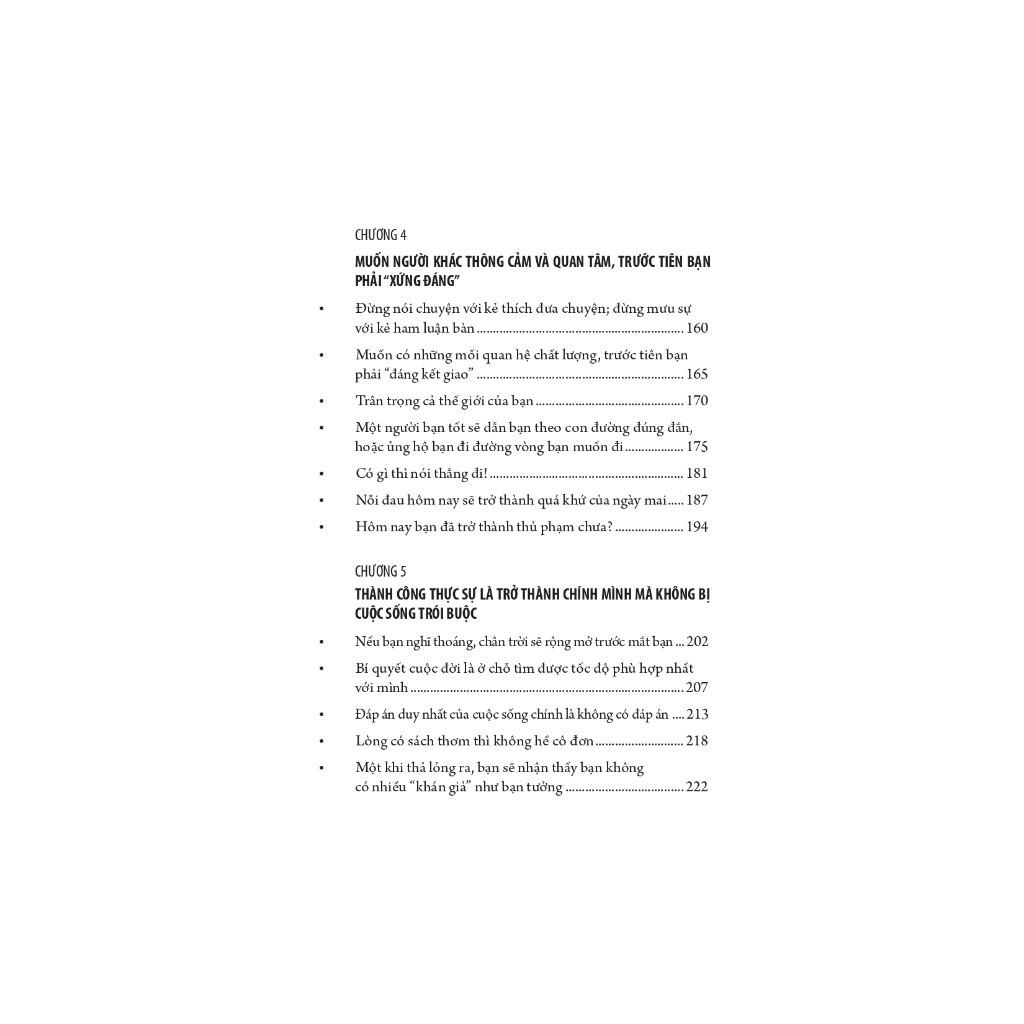 Chúng ta thường có xu hướng bỗng dưng theo đuổi một số thứ, rồi lại bất ngờ từ bỏ một số thứ. Chúng ta không đủ thấu hiểu bản thân và dễ bị cuốn theo số đông như một thói quen. Có lẽ đây chính là căn nguyên của mọi phiền não. Kinh nghiệm dành cho bạn là: Nhảy ra khỏi mục tiêu bạn muốn theo đuổi và nhìn rõ vị trí thực sự của nó trong thế giới này. Chỉ có như vậy, bạn mới không bị cuốn theo bất cứ ai hay sự vật nào, không vì có được mà vui quên trời đất, cũng không vì mất đi mà đau khổ đến tột cùng.