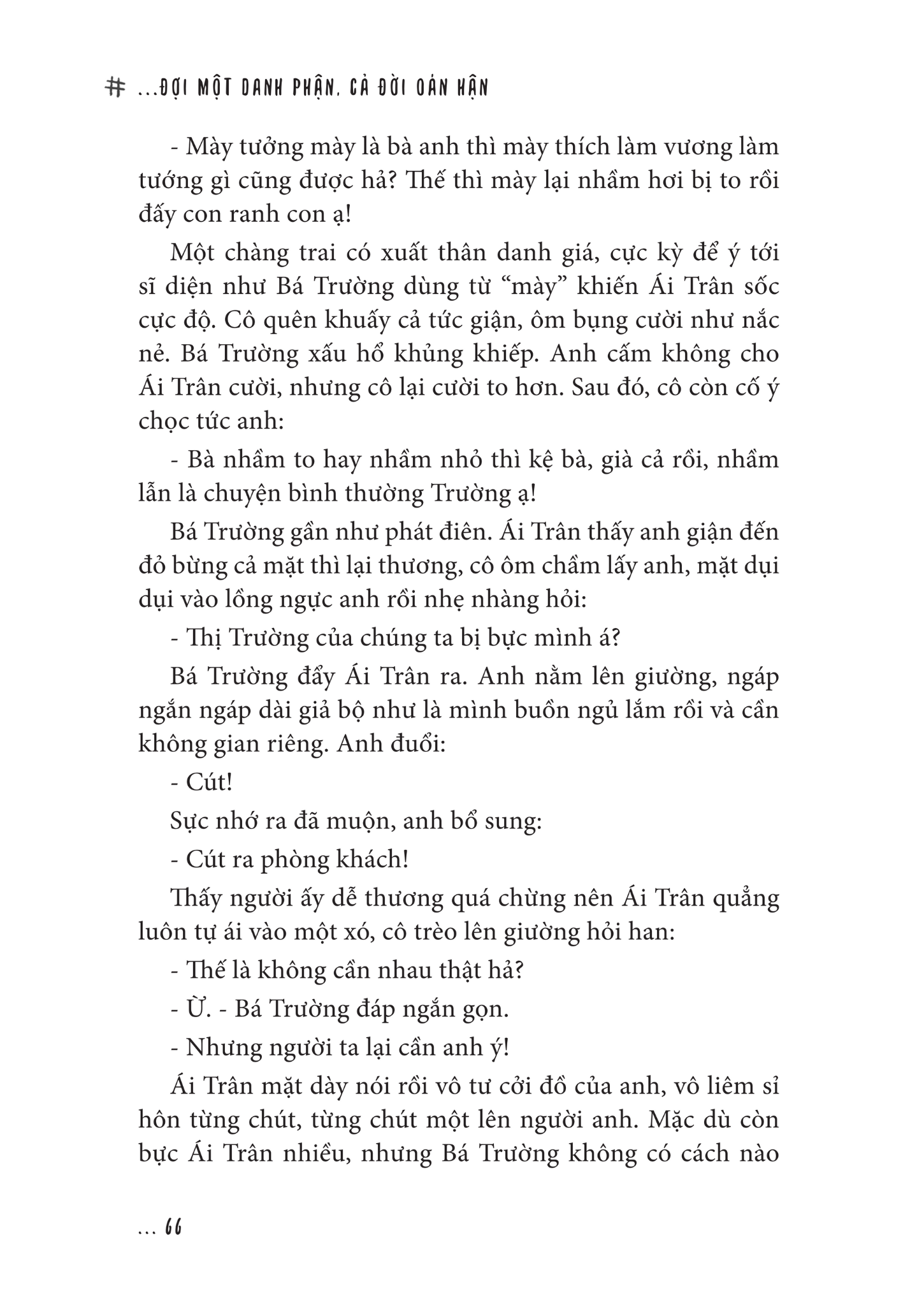 Ngọt ngào vừa đủ, đắng cay cũng trọn, “Đợi một danh phận, cả đời oán hận” của tác giả Lan Rùa là câu chuyện về cô gái cố chấp như thế. Cố chấp yêu, cố chấp tổn thương trong mối quan hệ rắc rối, trong thứ tình cảm dẫu biết sai trái nhưng không thể buông tay. Nhưng có lẽ cố chấp đến đâu thì một ngày nào đó cũng nên vì bản thân mà dừng lại, kết thúc chuỗi ngày trong vô vọng ấy.