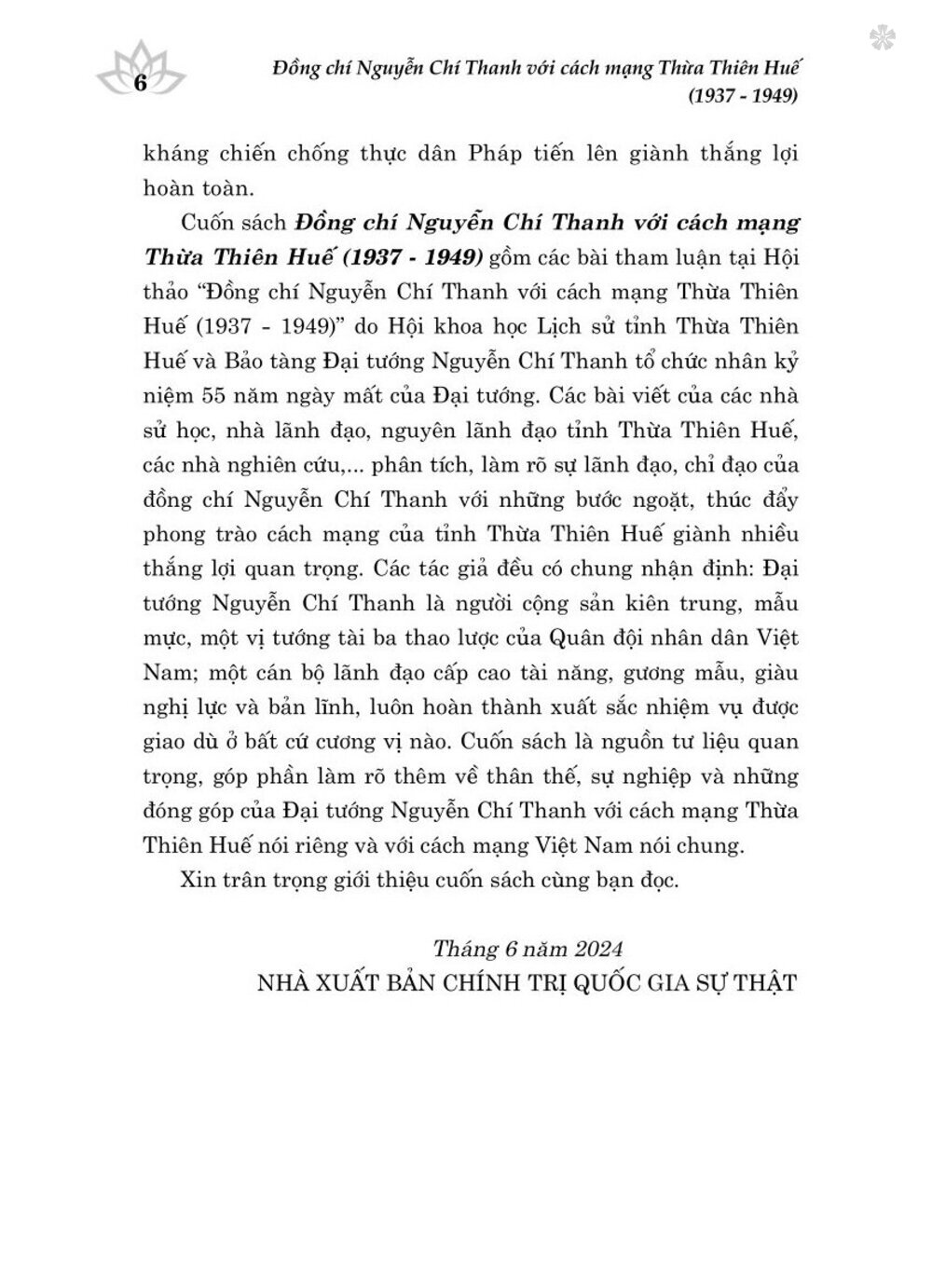 Cuốn sách là nguồn tư liệu quan trọng, góp phần làm rõ thêm về thân thế, sự nghiệp và những đóng góp của Đại tướng Nguyễn Chí Thanh với cách mạng Thừa Thiên Huế nói riêng và với cách mạng Việt Nam nói chung.