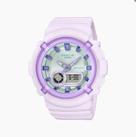 Thỏa mãn vị giác với mẫu đồng hồ BABY-G màu kẹo. Vỏ và dây đeo đẹp mắt phủ lớp hoàn thiện mờ kết hợp với đường gờ và vạch chỉ giờ bằng nhựa resin trong suốt tạo nên mặt số dễ đọc mang hình dáng và màu sắc của những viên kẹo dễ thương. Mẫu đồng hồ không chỉ ngọt ngào mà còn có tính thực tiễn cao với cấu trúc chống va đập và khả năng chống nước ở độ sâu 100 mét.