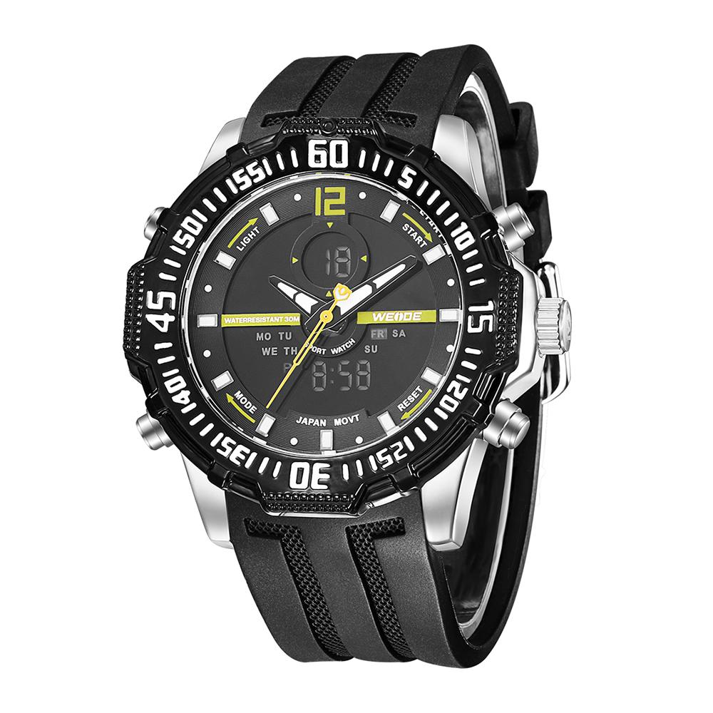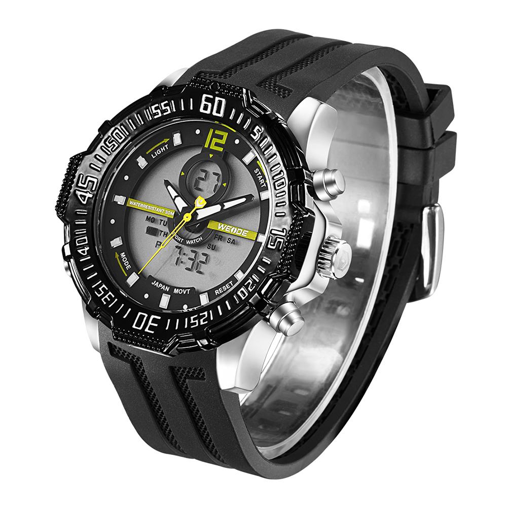 WEIDE WH6105 is a dual display quartz digital men watch for big-dial lover with tachymeter engraved on the case and the function of stopwatch and week. Features: - Six attractive versions for option. - Flashing
