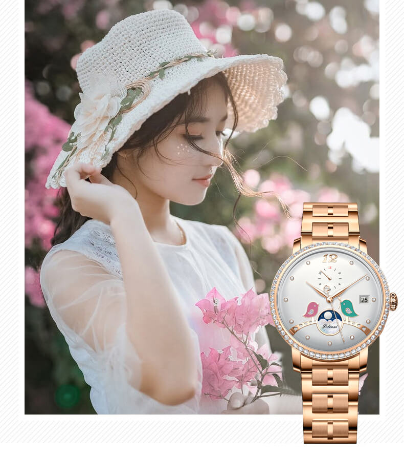 NGUỒN GỐC VÀ THÔNG SỐ SẢN PHẨM Thương Hiệu LOBINNI Mã sản phẩm L2065-5 Giới tính Nữ Loại sản phẩm Đồng hồ cơ (Automatic) Đường kính mặt 36 mm Chiều dày 9.7 mm Chất liệu