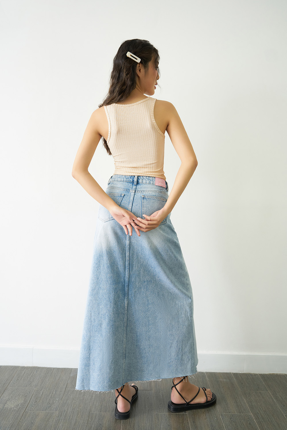Chân váy jeans xanh dáng dài chữ A xẻ tà phía sau