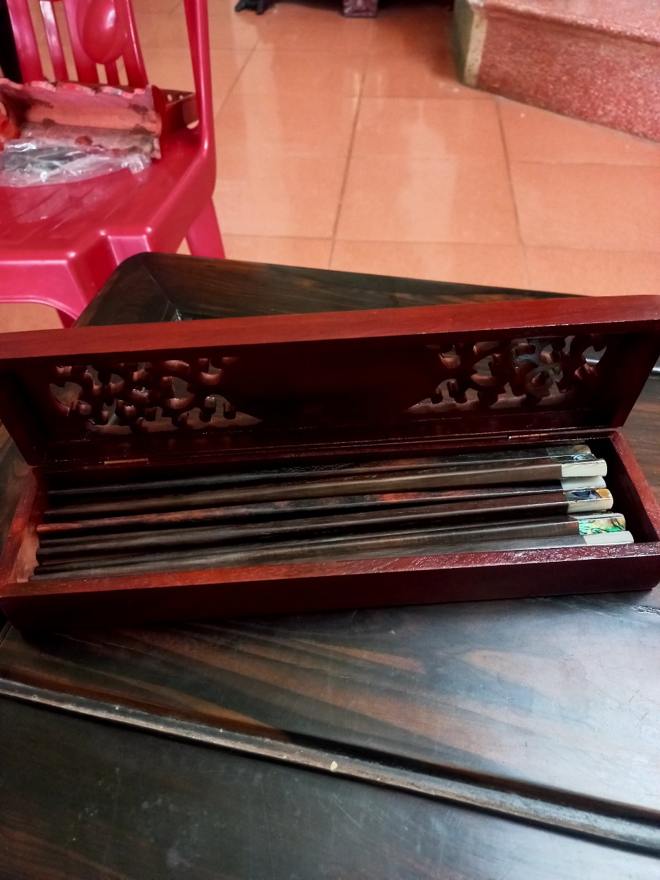 _ Combo đũa ăn bằng gỗ trắc đen đầu đũa được khảm ốc ,vỏ bào ngư xà cừ tự nhiên + hộp đựng đũa bằng gỗ hương