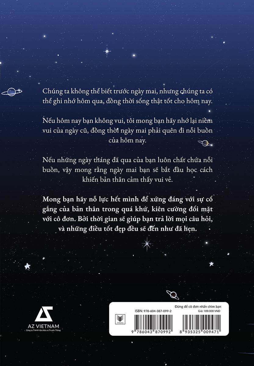 Đừng Để Cô Đơn Nhấn Chìm Bạn Một cuốn sách đến từ tác giả Trình Nhất - giúp bạn giữ ấm trái tim khỏi những cơn gió lạnh đầu đông, giữ vững tinh thần để vượt qua những thời khắc cô độc trong cuộc sống. Chúng ta không thể biết trước ngày mai, nhưng chúng ta có thể ghi nhớ hôm qua, đồng thời sống thật tốt cho hôm nay. Nếu hôm nay bạn không vui, mong bạn hãy nhớ lại niềm vui của ngày cũ, đồng thời ngày mai phải quên đi nỗi buồn của hôm nay. Nếu những ngày tháng đã quá của bạn luôn chất chứa nỗi buồn, vậy mong rằng ngày mai bạn sẽ bắt đầu học cách khiến bản thân cảm thấy vui vẻ. Mong bạn hãy nỗ lực hết mình để xứng đáng với sự cố gắng của bản thân trong quá khứ, kiên cường đối mặt với cô đơn. Bởi thời gian sẽ giúp bạn trả lời mọi câu hỏi, và những điều tốt đẹp đều sẽ đến như đã hẹn.